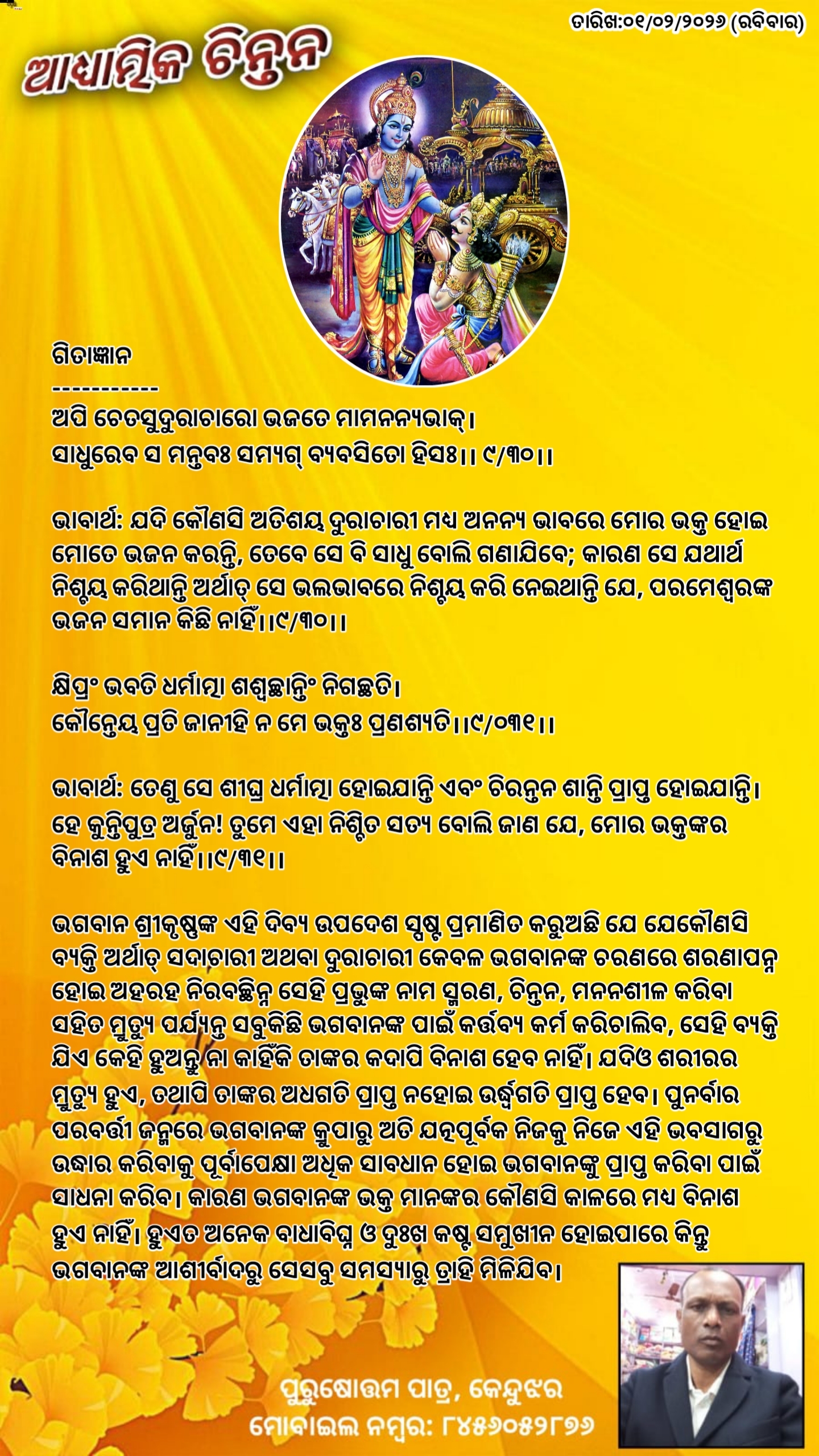 ଭାବାର୍ଥ: ଯଦି କୌଣସି ଅତିଶୟ ଦୁରାଚାରୀ ମଧ୍ଯ ଅନନ୍ୟ ଭାବରେ ମୋର ଭକ୍ତ ହୋଇ ମୋତେ ଭଜନ କରନ୍ତି, ତେବେ ସେ ବି ସାଧୁ ବୋଲି ଗଣାଯିବେ; କାରଣ ସେ ଯଥାର୍ଥ ନିଶ୍ଚୟ କରିଥାନ୍ତି ଅର୍ଥାତ୍ ସେ ଭଲଭାବରେ ନିଶ୍ଚୟ କରି ନେଇଥାନ୍ତି ଯେ, ପରମେଶ୍ୱରଙ୍କ ଭଜନ ସମାନ କିଛି ନାହିଁ।।୯/୩୦।।