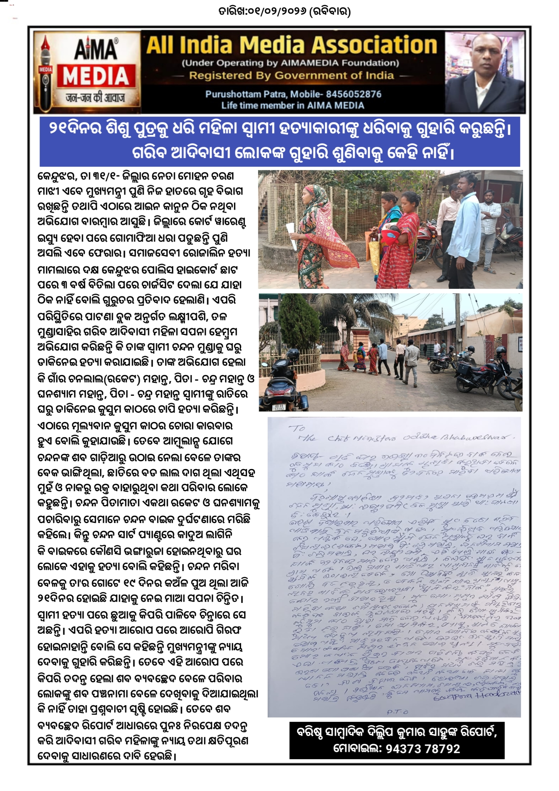 କେନ୍ଦୁଝର, ତା ୩୧/୧- ଜିଲ୍ଲାର ନେତା ମୋହନ ଚରଣ ମାଝୀ ଏବେ ମୁଖ୍ୟମନ୍ତ୍ରୀ ପୁଣି ନିଜ ହାତରେ ଗୃହ ବିଭାଗ ରଖିଛନ୍ତି ତଥାପି ଏଠାରେ ଆଇନ କାନୁନ ଠିକ ନଥିବା ଅଭିଯୋଗ ବାରମ୍ବାର ଆସୁଛି। ଜିଲ୍ଲାରେ କୋର୍ଟ ୱାରେଣ୍ଟ ଇସ୍ୟୁ ହେବା ପରେ ଗୋମାଫିଆ ଧରା ପଡୁଛନ୍ତି ପୁଣି ଅସଲି ଏବେ ଫେରାର। ସମାଜସେବୀ ରୋଜାଲିନ ହତ୍ୟା ମାମଲାରେ ଦକ୍ଷ କେନ୍ଦୁଝର ପୋଲିସ ହାଇକୋର୍ଟ ଛାଟ ପରେ ୩ ବର୍ଷ ବିତିଲା ପରେ ଚାର୍ଜସିଟ ଦେଲା ଯେ ଯାହା ଠିକ ନାହିଁ ବୋଲି ଗୁରୁତର ପ୍ରତିବାଦ ହେଲାଣି। ଏପରି ପରିସ୍ଥିତିରେ ପାଟଣା ବ୍ଲକ ଅନ୍ତର୍ଗତ ଲକ୍ଷ୍ମୀପଶି, ତଳ ମୁଣ୍ଡାସାହିର ଗରିବ ଆଦିବାସୀ ମହିଳା ସପନା ହେମ୍ବ୍ରମ ଅଭିଯୋଗ କରିଛନ୍ତି କି ତାଙ୍କ ସ୍ୱାମୀ ଚନ୍ଦନ ମୁଣ୍ଡାକୁ ଘରୁ ଡାକିନେଇ ହତ୍ୟା କରାଯାଇଛି। ତାଙ୍କ ଅଭିଯୋଗ ହେଲା କି ଗାଁର ଚନଲାଲ(ରକେଟ) ମହାନ୍ତ, ପିତା - ଚନ୍ଦ୍ର ମହାନ୍ତ ଓ ଘନଶ୍ୟାମ ମହାନ୍ତ, ପିତା - ଚନ୍ଦ୍ର ମହାନ୍ତ ସ୍ୱାମୀଙ୍କୁ ରାତିରେ ଘରୁ ଡାକିନେଇ କୁସୁମ କାଠରେ ଚାପି ହତ୍ୟା କରିଛନ୍ତି। ଏଠାରେ ମୂଲ୍ୟବାନ କୁସୁମ କାଠର ଚୋରା କାରବାର ହୁଏ ବୋଲି କୁହାଯାଉଛି। ତେବେ ଆମ୍ବୁଲାନ୍ସ ଯୋଗେ ଚନ୍ଦନଙ୍କ ଶବ ଗାଡ଼ିଆରୁ ଉଠାଇ ନେଲା ବେଳେ ତାଙ୍କର ବେକ ଭାଙ୍ଗିଥିଲା, ଛାତିରେ ବଡ ଲାଲ ଦାଗ ଥିଲା ଏଥିସହ ମୁହଁ ଓ ନାକରୁ ରକ୍ତ ବାହାରୁଥିବା କଥା ପରିବାର ଲୋକେ କହୁଛନ୍ତି। ଚନ୍ଦନ ପିତାମାତା ଏକଥା ରକେଟ ଓ ଘନଶ୍ୟାମକୁ ପଚାରିବାରୁ ସେମାନେ ଚନ୍ଦନ ବାଇକ ଦୁର୍ଘଟଣାରେ ମରିଛି କହିଲେ। କିନ୍ତୁ ଚନ୍ଦନ ସାର୍ଟ ପ୍ୟାଣ୍ଟରେ କାଦୁଅ ଲାଗିନି କି ବାଇକରେ କୌଣସି ଭଙ୍ଗାରୁଜା ହୋଇନଥିବାରୁ ଘର ଲୋକେ ଏହାକୁ ହତ୍ୟା ବୋଲି କହିଛନ୍ତି। ଚନ୍ଦନ ମରିବା ବେଳକୁ ତା'ର ଗୋଟେ ୧୯ ଦିନର କଅଁଳ ପୁଅ ଥିଲା ଆଜି ୨୧ଦିନର ହୋଇଛି ଯାହାକୁ ନେଇ ମାଆ ସପନା ଚିନ୍ତିତ । ସ୍ଵାମୀ ହତ୍ୟା ପରେ ଛୁଆକୁ କିପରି ପାଳିବେ ଚିନ୍ତାରେ ସେ ଅଛନ୍ତି। ଏପରି ହତ୍ୟା ଆରୋପ ପରେ ଆରୋପି ଗିରଫ ହୋଇନାହାନ୍ତି ବୋଲି ସେ କହିଛନ୍ତି ମୁଖ୍ୟମନ୍ତ୍ରୀଙ୍କୁ ନ୍ୟାୟ ଦେବାକୁ ଗୁହାରି କରିଛନ୍ତି। ତେବେ ଏହି ଆରୋପ ପରେ କିପରି ତଦନ୍ତ ହେଲା ଶବ ବ୍ୟବଚ୍ଛେଦ ବେଳେ ପରିବାର ଲୋକଙ୍କୁ ଶବ ପଞ୍ଚନାମା ବେଳେ ଦେଖିବାକୁ ଦିଆଯାଇଥିଲା କି ନାହିଁ ତାହା ପ୍ରଶ୍ନବାଚୀ ସୃଷ୍ଟି ହୋଇଛି। ତେବେ ଶବ ବ୍ୟବଚ୍ଛେଦ ରିପୋର୍ଟ ଆଧାରରେ ପୁନଃ ନିରପେକ୍ଷ ତଦନ୍ତ କରି ଆଦିବାସୀ ଗରିବ ମହିଳାଙ୍କୁ ନ୍ୟାୟ ତଥା କ୍ଷତିପୂରଣ ଦେବାକୁ ସାଧାରଣରେ ଦାବି ହେଉଛି।