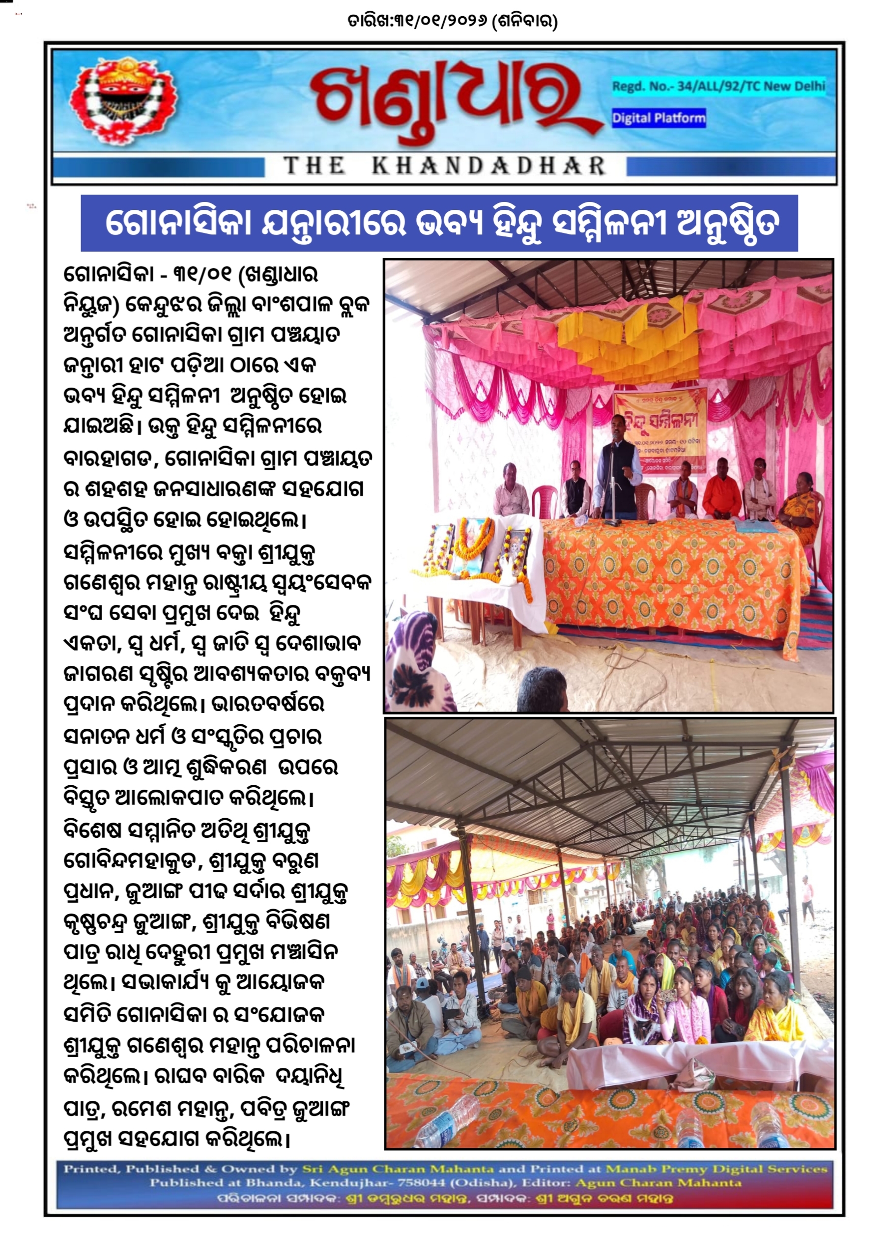 ଗୋନାସିକା - ୩୧/୦୧(ଖଣ୍ଡାଧାର ନିୟୁଜ) କେନ୍ଦୁଝର ଜିଲ୍ଲା ବାଂଶପାଳ ବ୍ଲକ ଅନ୍ତର୍ଗତ ଗୋନାସିକା ଗ୍ରାମ ପଞ୍ଚୟାତ ଜନ୍ତାରୀ ହାଟ ପଡ଼ିଆ ଠାରେ ଏକ ଭବ୍ଯ ହିନ୍ଦୁ ସମ୍ମିଳନୀ ଅନୁଷ୍ଠିତ ହୋଇ ଯାଇଅଛି । ଉକ୍ତ ହିନ୍ଦୁ ସମ୍ମିଳନୀରେ ବାରହାଗଡ, ଗୋନାସିକା ଗ୍ରାମ ପଞ୍ଚାୟତ ର ଶହଶହ ଜନସାଧାରଣଙ୍କ ସହଯୋଗ ଓ ଉପସ୍ଥିତ ହୋଇ ହୋଇଥିଲେ। ସମ୍ମିଳନୀରେ ମୁଖ୍ଯ ବକ୍ତା ଶ୍ରୀଯୁକ୍ତ ଗଣେଶ୍ବର ମହାନ୍ତ ରାଷ୍ଟ୍ରୀୟ ସ୍ୱୟଂସେବକ ସଂଘ ସେବା ପ୍ରମୁଖ ଦେଇ ହିନ୍ଦୁ ଏକତା, ସ୍ବ ଧର୍ମ , ସ୍ବ ଜାତି ସ୍ବ ଦେଶାଭାବ ଜାଗରଣ ସୃଷ୍ଟିର ଆବଶ୍ୟକତାର ବକ୍ତବ୍ଯ ପ୍ରଦାନ କରିଥିଲେ । ଭାରତବର୍ଷରେ ସନାତନ ଧର୍ମ ଓ ସଂସ୍କୃତିର ପ୍ରଚାର ପ୍ରସାର ଓ ଆତ୍ମ ଶୁଦ୍ଧିକରଣ ଉପରେ ବିସ୍ତୃତ ଆଲୋକପାତ କରିଥିଲେ । ବିଶେଷ ସମ୍ମାନିତ ଅତିଥି ଶ୍ରୀଯୁକ୍ତ ଗୋବିନ୍ଦମହାକୁଡ, ଶ୍ରୀଯୁକ୍ତ ବରୁଣ ପ୍ରଧାନ, ଜୁଆଙ୍ଗ ପୀଢ ସର୍ଦାର ଶ୍ରୀଯୁକ୍ତ କୃଷ୍ଣଚନ୍ଦ୍ର ଜୁଆଙ୍ଗ, ଶ୍ରୀଯୁକ୍ତ ବିଭିଷଣ ପାତ୍ର ରାଧି ଦେହୁରୀ ପ୍ରମୁଖ ମଞ୍ଚାସିନ ଥିଲେ। ସଭାକାର୍ଯ୍ୟ କୁ ଆୟୋଜକ ସମିତି ଗୋନାସିକା ର ସଂଯୋଜକ ଶ୍ରୀଯୁକ୍ତ ଗଣେଶ୍ବର ମହାନ୍ତ ପରିଚାଳନା କରିଥିଲେ । ରାଘବ ବାରିକ ଦୟାନିଧି ପାତ୍ର, ରମେଶ ମହାନ୍ତ, ପବିତ୍ର ଜୁଆଙ୍ଗ ପ୍ରମୁଖ ସହଯୋଗ କରିଥିଲେ।