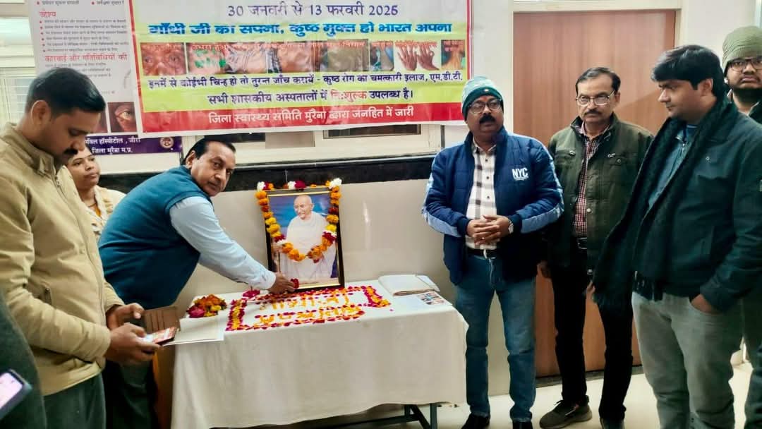 मुख्य चिकित्सा एवं स्वास्थ्य अधिकारी डॉ पद्मेश उपाध्याय एवं कुष्ठ नोडल अधिकारी डॉ चंद्रकांत दुबे के निर्देश एवं मुख्य खंड चिकित्सा अधिकारी डॉ आर एस सेमिल के मार्गदर्शन में महात्मा गांधी जी की पुण्यतिथि के अवसर पर एन एम ए कमलेश कुमार श्रीवास्तव द्वारा सिविल हॉस्पिटल जोरा में कुष्ठ निवारण दिवस का आयोजन किया गया एवं स्पर्श कुष्ठ जागरूकता अभियान प्रारंभ किया। यह अभियान 13 फरवरी 2026 तक चलाया जाएगा। कार्यक्रम के प्रारंभ में राष्ट्रपिता महात्मा गांधी जी के चित्र पर उपस्थित लोगों ने माल्यार्पण एवं पुष्प अर्पित कर उन्हें श्रद्धांजलि दी एवं उन की याद में मौन धारण किया गया। इस अवसर पर डॉ गोविंद पवार, डॉ अनिल राजपूत, आयुर्वेद चिकित्सा अधिकारी डॉ किरन शाक्य, डॉ हरिओम मीणा, डॉ आर बी शर्मा डॉ अमित चौधरी डॉ संत कुमार मीणा,बी ई ई भूपेंद्र धाकड़ आईसीटीसी परामर्शदाता संदीप सेंगर, एस टी एस रणवीर गोयल, नेत्र चिकित्सा सहायक सुनील यादव,एम पी एस वीरेश अवस्थी, रनवीर पारा, एम पी डब्ल्यू योगेंद्र सिंह सिकरवार, आदि लोग उपस्थिति थे ।