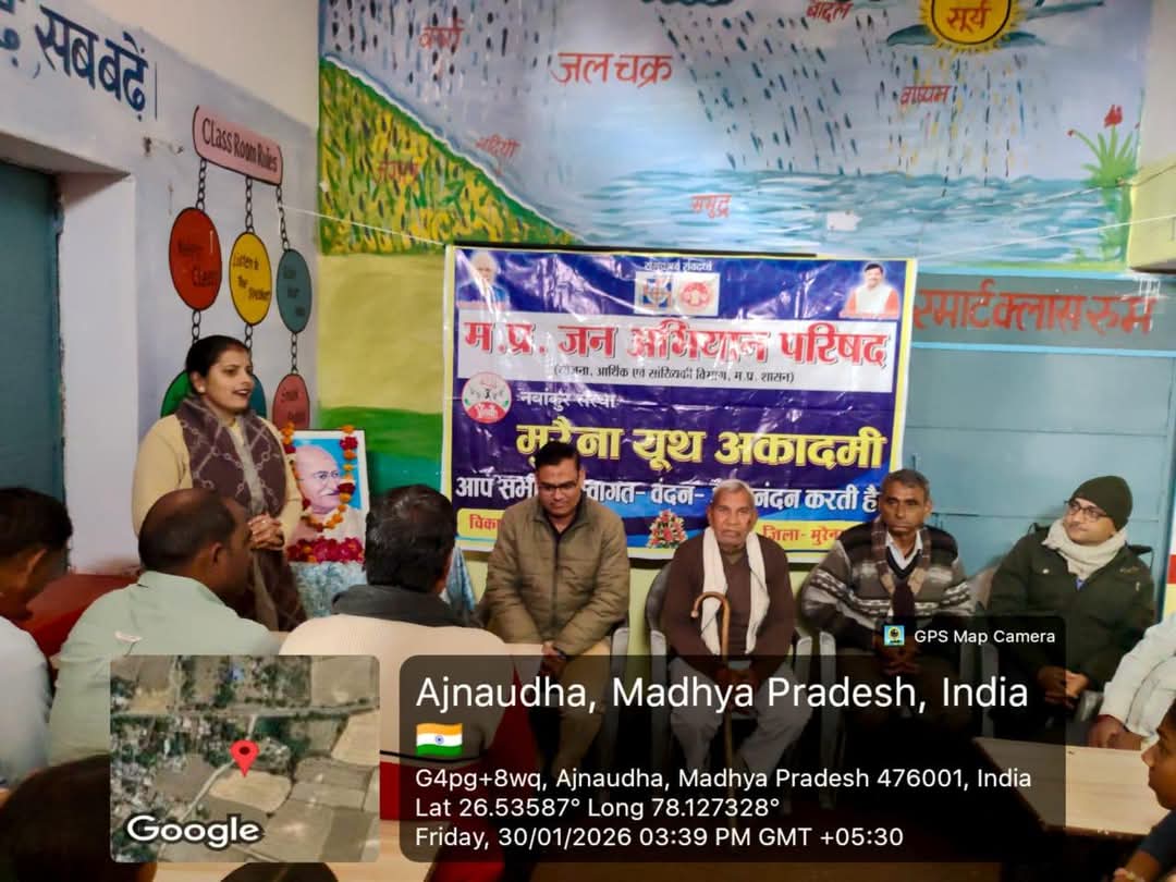 मध्य प्रदेश जन अभियान परिषद चंबल संभाग के संभागीय समन्वयक श्री धर्मेंद्र सिंह सिसोदिया एवं जिला समन्वयक श्री सतीश सिंह तोमर के निर्देश एवं विकास खण्ड समन्वयक श्री अनिल मोदी के मार्गदर्शन में नवांकुर संस्था मुरैना यूथ अकादमी द्वारा 30 जनवरी 2026 राष्ट्रपिता महात्मा गांधी जी की पुण्यतिथि को ‘‘मद्य निषेध संकल्प दिवस’’ के रूप मनाना गया । इस अवसर पर लोगों को नशे के प्रति जागरूक करने हेतु शासकीय माध्यमिक विद्यालय अजनोधा में जागरूकता संगोष्ठी का आयोजन किया गया। संगोष्ठी में विद्यालय के प्रधान अध्यापक श्री जाहिद हुसैन, नवांकुर संस्था मुरैना यूथ अकादमी के प्रतिनिधि संदीप सेंगर,मुख्यमंत्री नेतृत्व क्षमता विकास पाठ्यक्रम की मैटर एवं सह प्रभारी श्रीमती सायरा जैन,आशा कार्यकर्ता सीमा राजोरिया, ग्राम विकास प्रस्फुटन समिति अजनोधा के अध्यक्ष वीरेंद्र राजोरिया आदि ग्रामीण महिला,पुरुष व विद्यालय के छात्र-छात्राएं मौजूद थे।