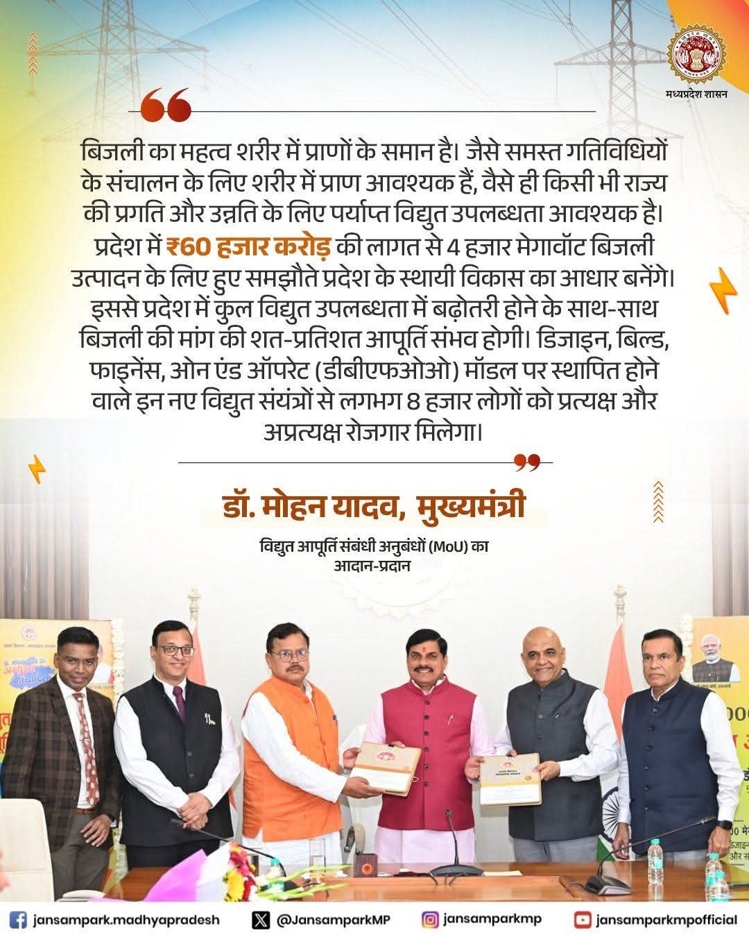 बिजली का महत्व शरीर में प्राणों के समान है। जैसे समस्त गतिविधियों के संचालन के लिए शरीर में प्राण आवश्यक हैं, वैसे ही किसी भी राज्य की प्रगति और उन्नति के लिए पर्याप्त विद्युत उपलब्धता आवश्यक है। प्रदेश में ₹60 हजार करोड़ की लागत से 4 हजार मेगावॉट बिजली उत्पादन के लिए हुए समझौते प्रदेश के स्थायी विकास का आधार बनेंगे।