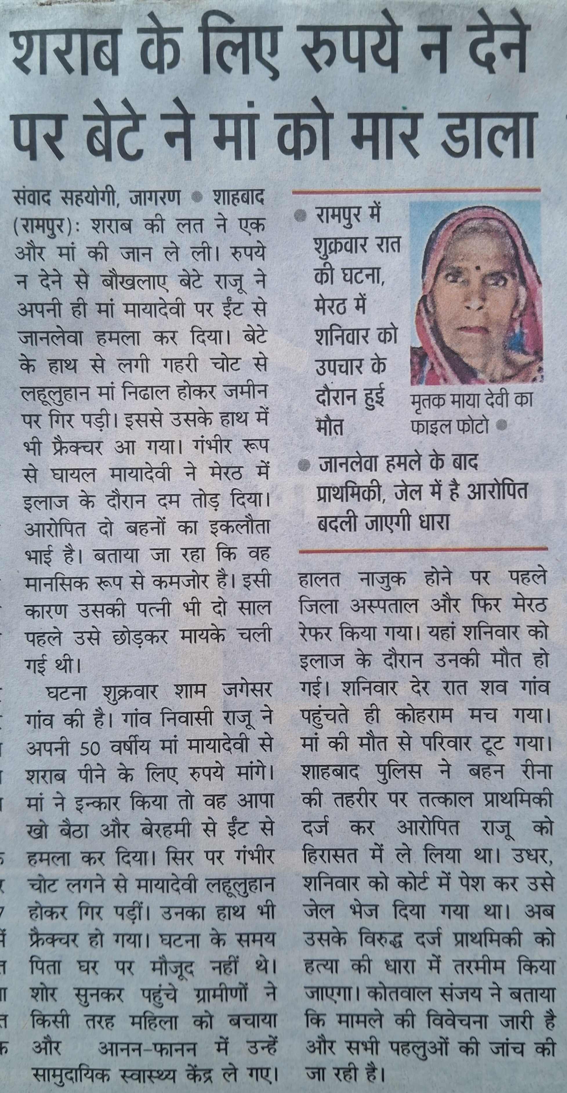 शराब के लिए पैसे न देने पर कलयुगी बेटे ने मां की हत्या की, रामपुर में सनसनी