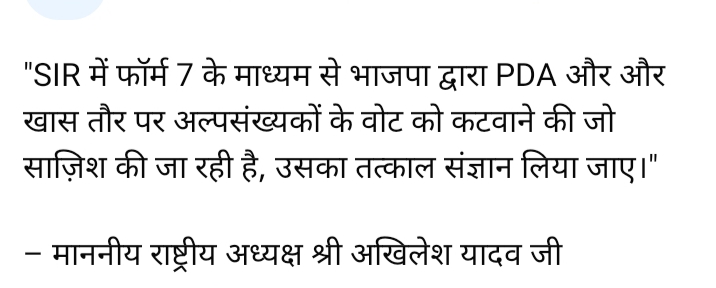 SIR में फॉर्म 7 के माध्यम से भाजपा द्वारा PDA और खास तौर पर अल्पसंख्यकों के वोट को कटवाने की जो साज़िश की जा रही है उसका तत्काल संज्ञान लिया जाए -