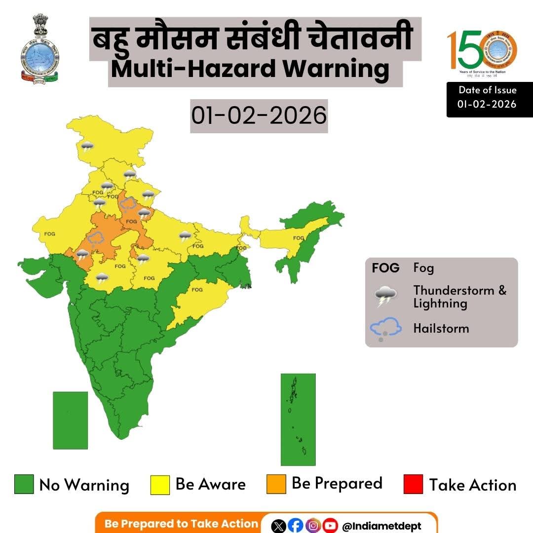 भारतीय मौसम विज्ञान विभाग IMD द्वारा जारी सम्पूर्ण भारत का क्षेत्रवार 7 दिवसीय विस्तृत मौसम पूर्वानुमान व चेतावनी बुलेटिन अपडेट 1 फरवरी, 2026
