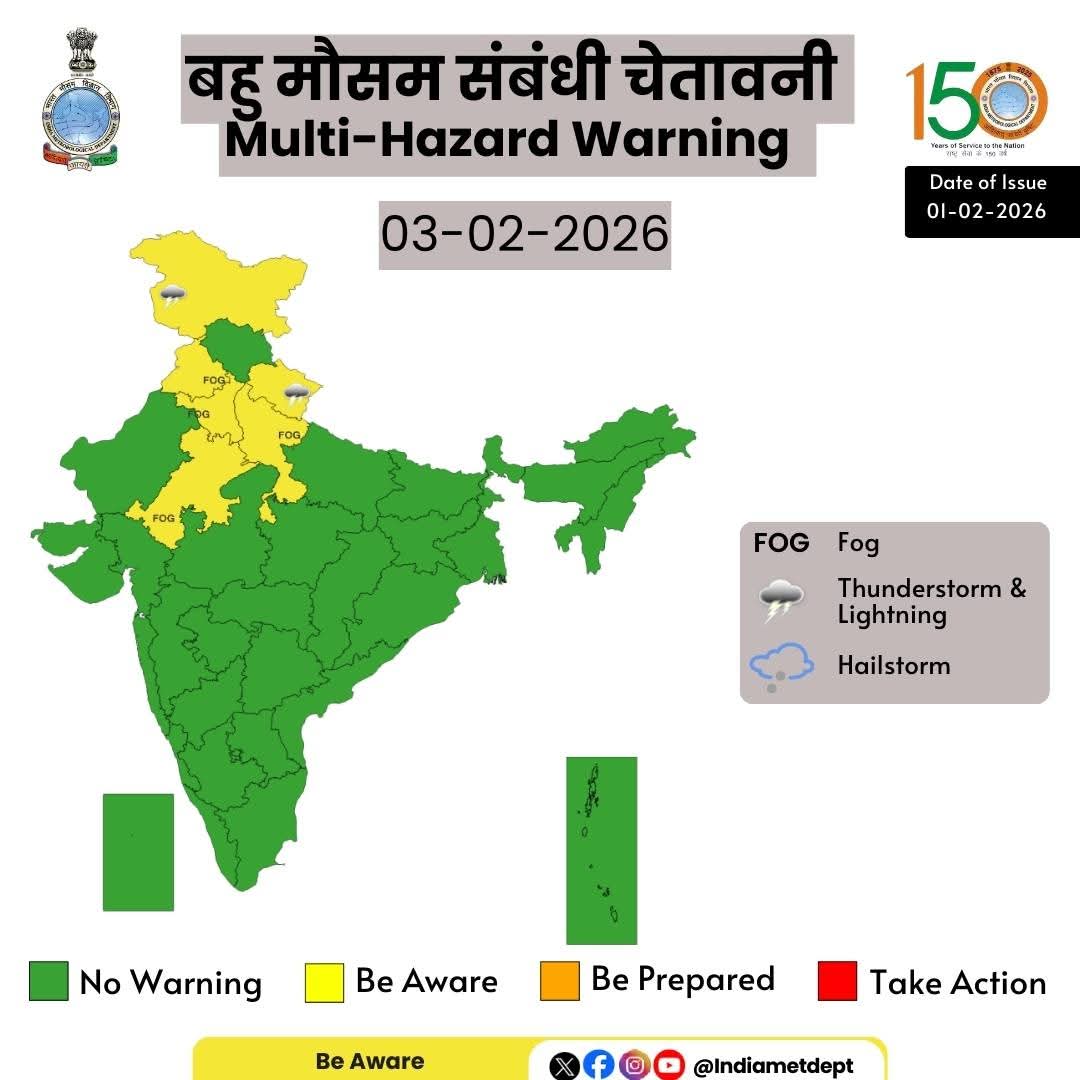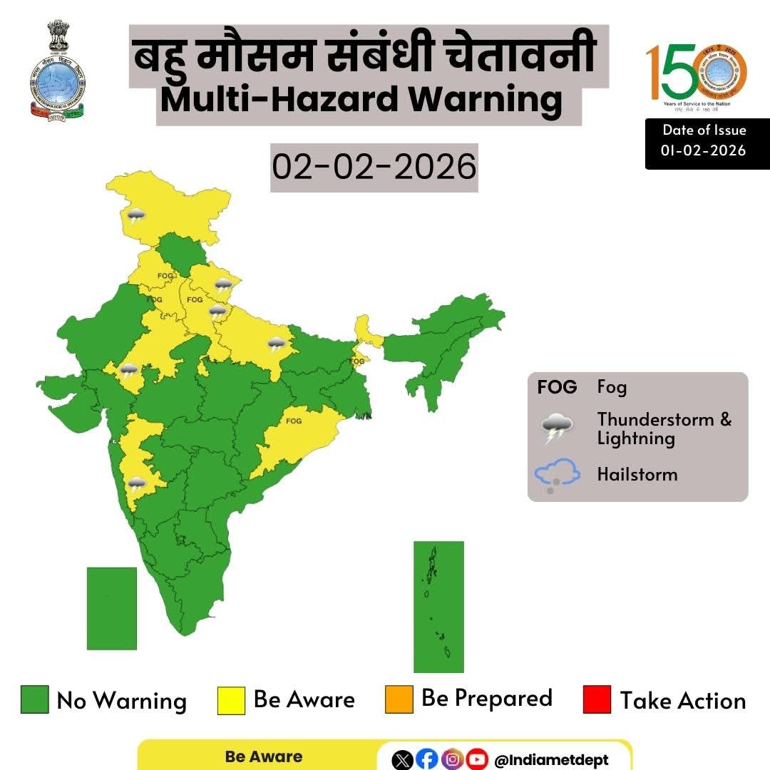 ❖ 01 फरवरी को पंजाब, हरियाणा, चंडीगढ़ और मध्य प्रदेश में और 01 और 02 फरवरी को उत्तर प्रदेश और पूर्वी राजस्थान में और 02 फरवरी 2026 के दौरान मध्य महाराष्ट्र में गरज, बिजली और तेज़ हवाओं (30-40 से 50 किमी प्रति घंटे की रफ्तार) के साथ हल्की बारिश होने की संभावना है।
