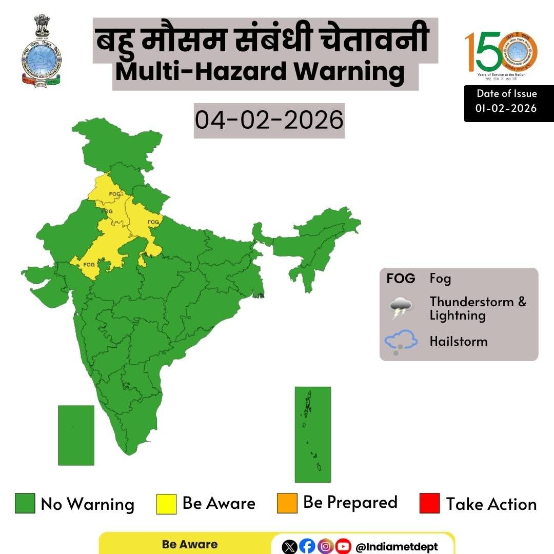 ❖ पंजाब, हरियाणा, चंडीगढ़ में 03 फरवरी तक और कुछ जगहों पर 5 फरवरी तक सुबह/रात के घंटों में घना कोहरा छाए रहने की संभावना है। पश्चिमी उत्तर प्रदेश में 5 फरवरी तक; पश्चिमी राजस्थान, मध्य प्रदेश, बिहार और असम और मेघालय में 02 फरवरी तक; उप-हिमालयी पश्चिम बंगाल और सिक्किम और ओडिशा में 03 फरवरी तक; पूर्वी राजस्थान में 03-05 फरवरी 2026 के दौरान कुछ जगहों पर घना कोहरा छाए रहने की संभावना है।