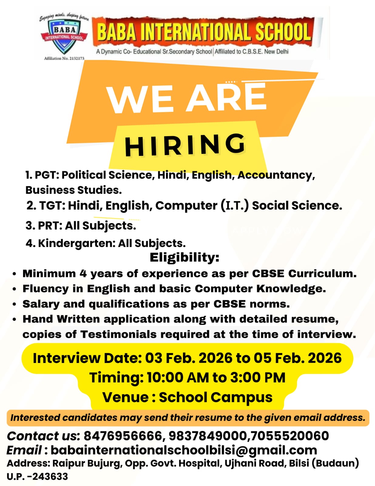 बिल्सी: बाबा इंटरनेशनल स्कूल की एकेडमिक टीम में शामिल होने के लिए जोशीले और समर्पित शिक्षकों को आमंत्रित करता है।