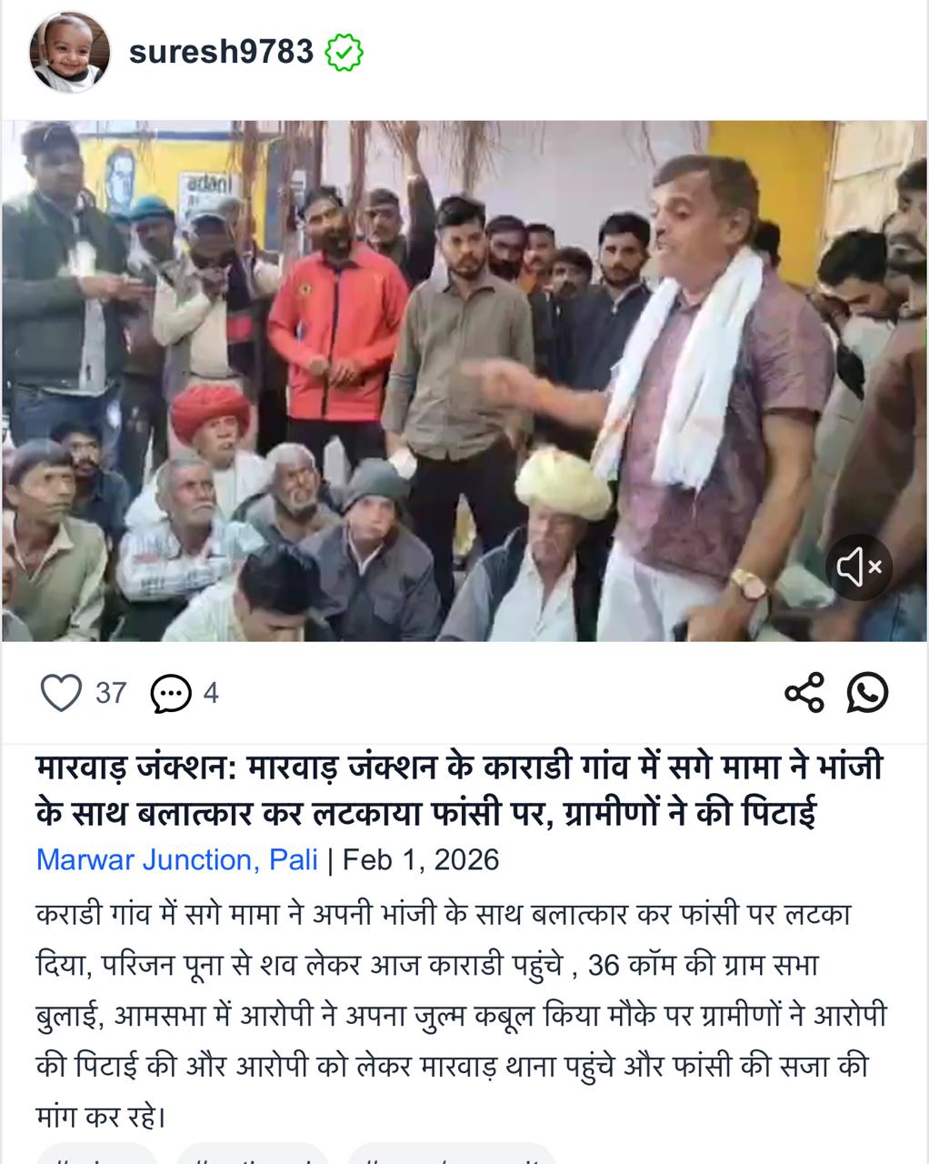 पुणे शहर मे सगे मामा ने भांजी से बलात्कार कर , मौत के घाट उतार दिया । ये मामला तब उजागर हुआ जब भांजी की मौत पर किसी ग्रामीणों को शक हुआ तब उनका पोस्टमार्टम एक दूसरे अस्पताल मे करवाया गया , शक के आधार पर बलात्कारी के गांव काराड़ी मे आम जन की 36कौम सभा बुलाकर मामा को पुणे से गांव बुलाया गया , पूरे गांव के सामने उसने ये जुर्म कबूल किया, गुच्छाएं लोगों ने उसकी अच्छी खातिरदारी करके थाने लेकर गए , वहां पर ग्रामीणों ने फांसी की मांग रखी है ।