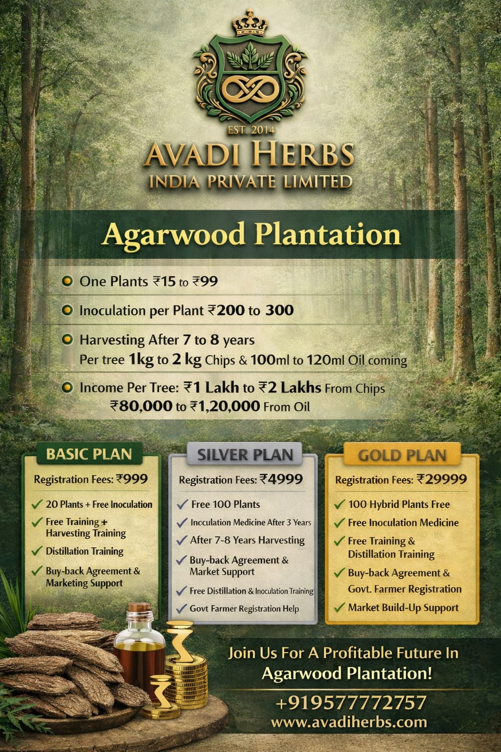 Agarwood cultivation is rapidly emerging as one of the most profitable agroforestry ventures in India, offering farmers a sustainable and high-value income opportunity. Avadi Herbs India Private Limited, a Hojai-based agroforestry company, is playing a key role in promoting scientific agarwood farming among Indian farmers through structured plantation models, training, and market support.
