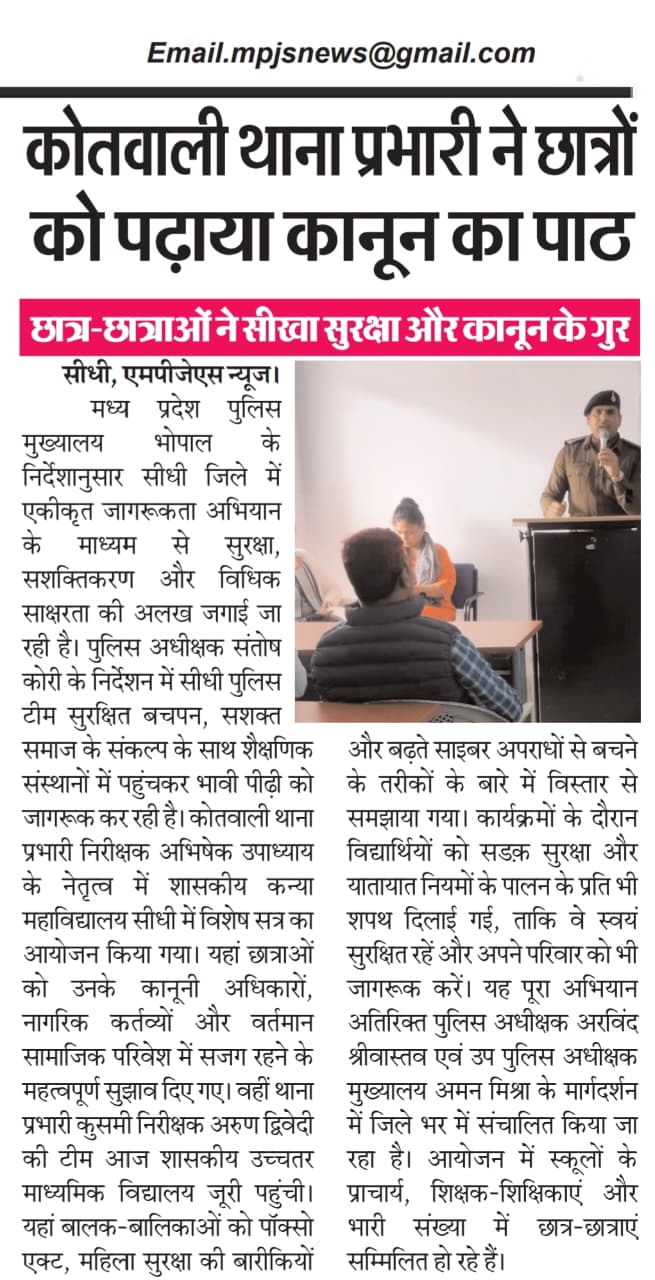 मध्य प्रदेश पुलिस मुख्यालय भोपाल के निर्देशानुसार सीधी जिले में एकीकृत जागरूकता अभियान के माध्यम से सुरक्षा, सशक्तिकरण और विधिक साक्षरता की अलख जगाई जा रही है। पुलिस अधीक्षक संतोष कोरी के निर्देशन में सीधी पुलिस टीम सुरक्षित बचपन, सशक्त समाज के संकल्प के साथ शैक्षणिक संस्थानों में पहुंचकर भावी पीढ़ी को जागरूक कर रही है। कोतवाली थाना प्रभारी निरीक्षक अभिषेक उपाध्याय के नेतृत्व में शासकीय कन्या महाविद्यालय सीधी में विशेष सत्र का आयोजन किया गया। यहां छात्राओं को उनके कानूनी अधिकारों, नागरिक कर्तव्यों और वर्तमान सामाजिक परिवेश में सजग रहने के महत्वपूर्ण सुझाव दिए गए। वहीं थाना प्रभारी कुसमी निरीक्षक अरुण द्विवेदी की टीम आज शासकीय उच्चतर माध्यमिक विद्यालय जूरी पहुंची। यहां बालक-बालिकाओं को पॉक्सो एक्ट, महिला सुरक्षा की बारीकियों