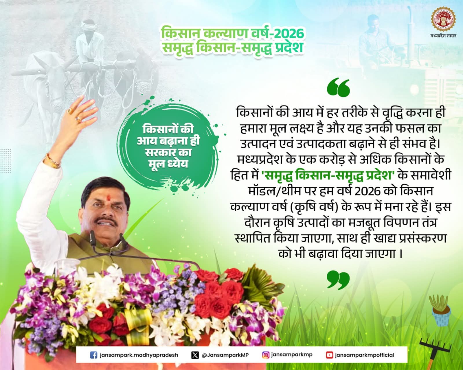 किसानों की आय में हर तरीके से वृद्धि करना ही हमारा मूल लक्ष्य है और यह उनकी फसल का उत्पादन एवं उत्पादकता बढ़ाने से ही संभव है। मध्यप्रदेश के एक करोड़ से अधिक किसानों के हित में 'समृद्ध किसान-समृद्ध प्रदेश' के समावेशी मॉडल/थीम पर हम वर्ष 2026 को किसान कल्याण वर्ष (कृषि वर्ष) के रूप में मना रहे हैं। इस दौरान कृषि उत्पादों का मजबूत विपणन तंत्र स्थापित किया जाएगा, साथ ही खाद्य प्रसंस्करण को भी बढ़ावा दिया जाएगा ।