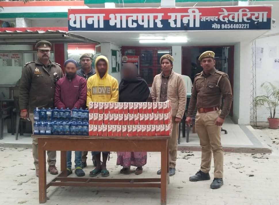 पुलिस अधीक्षक जनपद देवरिया श्री संजीव सुमन द्वारा अपराध एवं अपराधियों तथा अवैध शराब तस्करी की रोकथाम हेतु चलाये जा रहे अभियान *“आप्रेशन प्रहार”* के तहत अपर पुलिस अधीक्षक ( दक्षिणी) श्री सुनील कुमार सिंह के कुशल निर्देशन व क्षेत्राधिकारी भाटपाररानी श्री अंशुमान श्रीवास्तव के कुशल पर्यवेक्षण में थानाध्यक्ष अभिषेक कुमार राय थाना भाटपाररानी जनपद देवरिया के नेतृत्व में टीम द्वारा दिनांक 03.02.2026 को देखभाल क्षेत्र के दौरान मुखबिर की सूचना पर रेलवे स्टेशन भाटपाररानी के पास से 02 अभियुक्तों 01. अनिल कुमार पुत्र श्री नरायण शाह निवासी गुलबाग मधुबन थाना गुलबाग जनपद मोतीहारी(बिहार) 02. मुन्ना कुमार पुत्र सुजिन्द्र राय निवासी मोहाद्दी नगर थाना मोहाद्दी नगर जनपद समस्तीपुर(बिहार) *एवं* 01 अभियुक्ता पार्वती पत्नी स्व0 रामनन्दन निवासी मोहाद्दी नगर टोला कांचा थाना मोहाद्दी नगर जनपद समस्तीपुर(बिहार) को गिरफ्तार करते हुए उनके पास से 03 अदद झोले से कुल 167 अदद पैक अंग्रेजी शराब ब्राण्ड आफीसर च्वाइस (124 पैक) एवं आफ्टर डार्क ब्लू (43 पैक) की कुल मात्रा 30 लीटर बरामद किया गया । बरामद शराब को कब्जा पुलिस में लेकर थाना स्थानीय पर मु0अ0सं0- 0021/2026 धारा 60 आबकारी अधिनियम का अभियोग पंजीकृत करते हुए नियमानुसार विधिक कार्यवाही की जा रही है ।