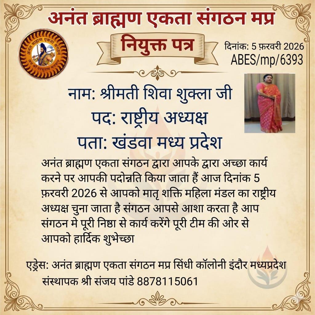 जन प्रतिनिधि खंडवा मध्य प्रदेश अनंत ब्राह्मण एकता संगठन के राष्ट्रीय संरक्षक पंडित श्री प्रकाश चन्द्र दुबे राष्ट्रीय सुरक्षा प्रमुख पंडित श्री आशीष तिवारी जी राष्ट्रीय संपादक एवं प्रमुख पंडित श्री संजय पांडे जी राष्ट्रीय अध्यक्ष पंडित श्री सोनू पांडेय जी राष्ट्रीय एवं राष्ट्रीय पद अधिकारी के सहमति से पदोन्नति किया जाता हैं मातृ शक्ति महिला मंडल के नव निर्वाचित राष्ट्रीय अध्यक्ष चुना जाता हैं श्रीमति शिवा शुक्ला जी को अनंत ब्राह्मण एकता संगठन की पुरी टीम की ओर से आपको हार्दिक शुभकामनाएं