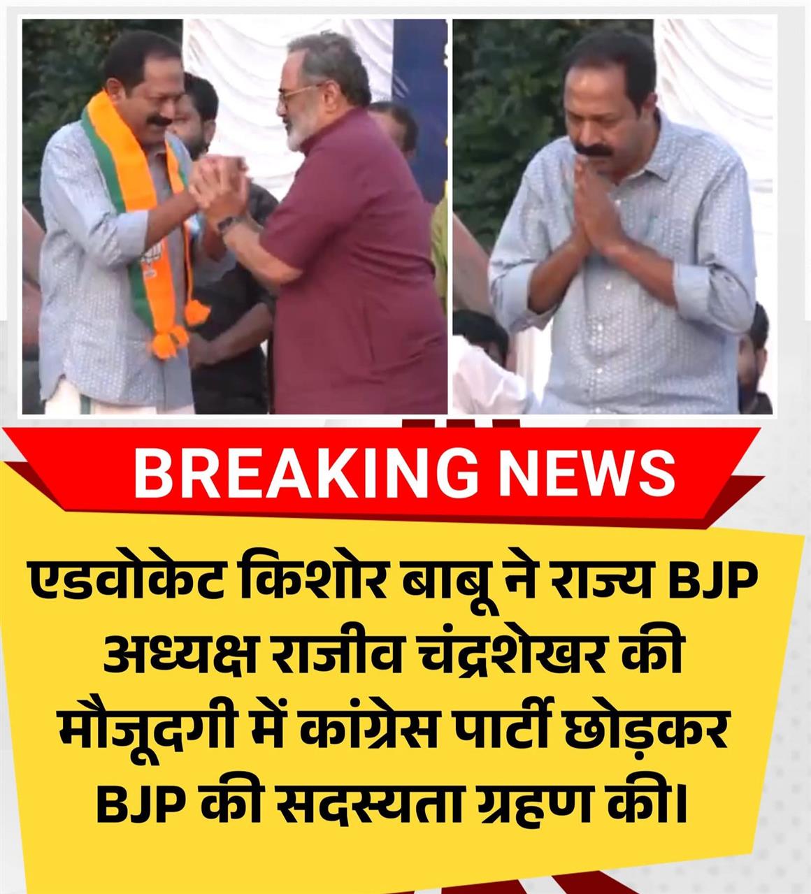 एडवोकेट किशोर बाबू ने राज्य BJP अध्यक्ष राजीव चंद्रशेखर की मौजूदगी में कांग्रेस पार्टी छोड़कर BJP की सदस्यता ग्रहण की।....💥
