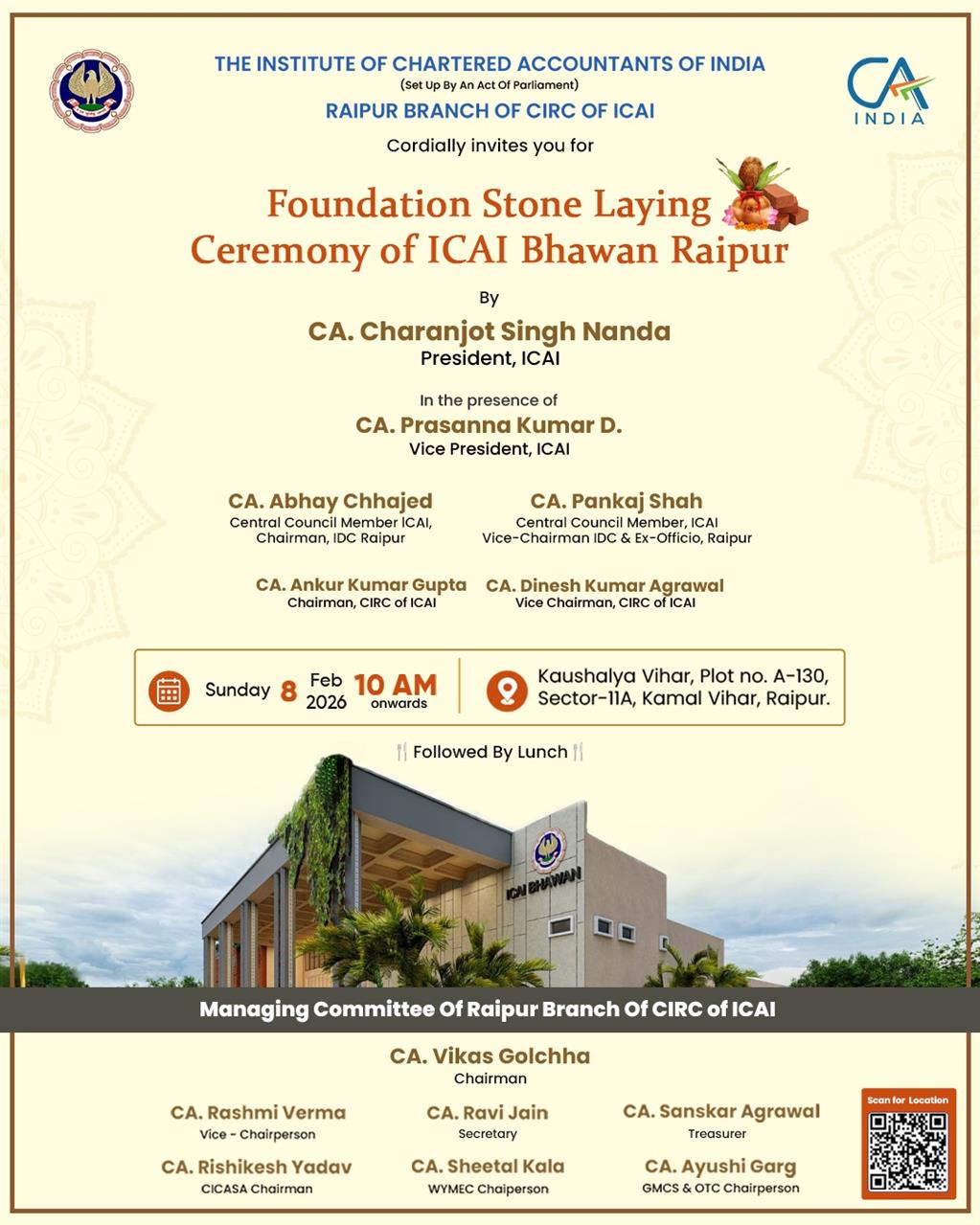 सम्माननीय महानुभव छत्तीसगढ़ की राजधानी रायपुर पर भारतीय चार्टर्ड अकाउंट इंस्टीट्यूट { ICAI } भवन शिलान्यास समारोह आयोजन दिनांक 8 फरवरी 2026 प्रातः 10:00 बजे दिन रविवार को आमंत्रित सम्माननीय ICAI अध्यक्ष CA चरणजोत सिंह नंदा एवं वरिष्ठ पदाधिकारी गणमान्य के नेतृत्व पर शिलान्यास समारोह संपन्न होगा।