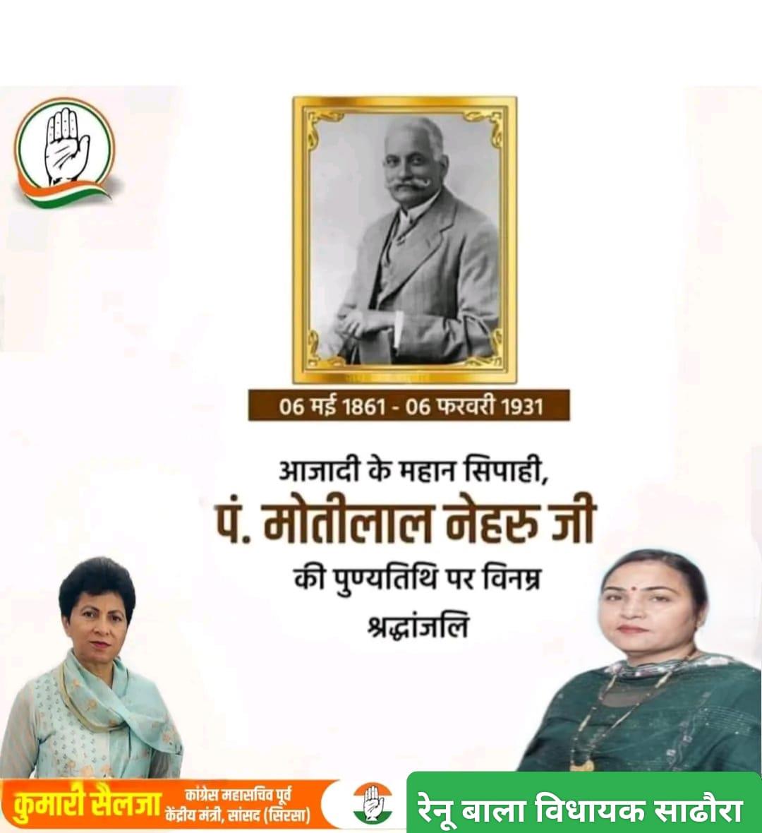 कपुरी :- हल्का सधौरा विधायक मैडम रेणु बाला जी नें नमन किया, "महान स्वाधीनता संग्राम सेनानी,भारतीय राष्ट्रीय कांग्रेस के पूर्व अध्यक्ष, मोती लाल नेहरू जी की पुण्यतिथि पर उन्हें शत-शत नमन। भावभीनी श्रद्धांजलि" !