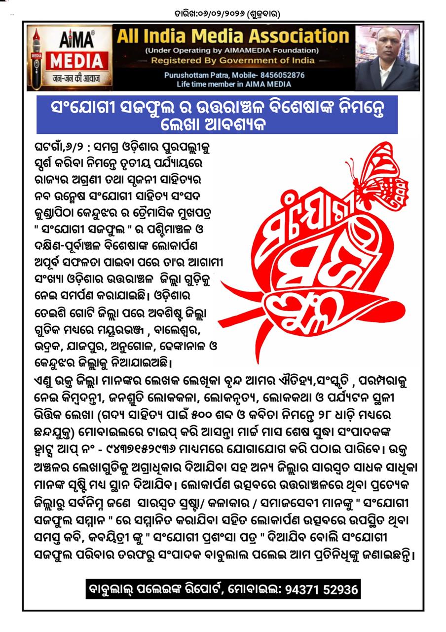 ଘଟଗାଁ,୬/୨ : ସମଗ୍ର ଓଡ଼ିଶାର ପୁରପଲ୍ଲୀକୁ ସ୍ପର୍ଶ କରିବା ନିମନ୍ତେ ତୃତୀୟ ପର୍ଯ୍ୟାୟରେ ରାଜ୍ୟର ଅଗ୍ରଣୀ ତଥା ସୃଜନୀ ସାହିତ୍ୟର ନବ ଉନ୍ମେଷ ସଂଯୋଗୀ ସାହିତ୍ୟ ସଂସଦ କୁଣ୍ଡାପିଠା କେନ୍ଦୁଝର ର ତ୍ରୈମାସିକ ମୁଖପତ୍ର " ସଂଯୋଗୀ ସଜଫୁଲ " ର ପଶ୍ଚିମାଞ୍ଚଳ ଓ ଦକ୍ଷିଣ-ପୂର୍ବାଞ୍ଚଳ ବିଶେଷାଙ୍କ ଲୋକାର୍ପଣ ଅପୂର୍ବ ସଫଳତା ପାଇବା ପରେ ତା'ର ଆଗାମୀ ସଂଖ୍ୟା ଓଡ଼ିଶାର ଉତ୍ତରାଞ୍ଚଳ ଜିଲ୍ଲା ଗୁଡ଼ିକୁ ନେଇ ସମର୍ପଣ କରାଯାଇଛି । ଓଡ଼ିଶାର ତେଇଶି ଗୋଟି ଜିଲ୍ଲା ପରେ ଅବଶିଷ୍ଟ ଜିଲ୍ଲା ଗୁଡିକ ମଧ୍ୟରେ ମୟୂରଭଞ୍ଜ , ବାଲେଶ୍ଵର, ଭଦ୍ରକ, ଯାଜପୁର, ଅନୁଗୋଳ, ଢେଙ୍କାନାଳ ଓ କେନ୍ଦୁଝର ଜିଲ୍ଲାକୁ ନିଆଯାଇଅଛି ।ଏଣୁ ଉକ୍ତ ଜିଲ୍ଲା ମାନଙ୍କର ଲେଖକ ଲେଖିକା ବୃନ୍ଦ ଆମର ଐତିହ୍ୟ,ସଂସ୍କୃତି , ପରମ୍ପରାକୁ ନେଇ କିମ୍ବଦନ୍ତୀ, ଜନଶ୍ରୁତି ଲୋକକଳା, ଲୋକନୃତ୍ୟ, ଲୋକକଥା ଓ ପର୍ଯ୍ୟଟନ ସ୍ଥଳୀ ଭିତ୍ତିକ ଲେଖା ( ଗଦ୍ୟ ସାହିତ୍ୟ ପାଇଁ ୫୦୦ ଶବ୍ଦ ଓ କବିତା ନିମନ୍ତେ ୨୮ ଧାଡ଼ି ମଧ୍ୟରେ ଛନ୍ଦଯୁକ୍ତ ) ମୋବାଇଲରେ ଟାଇପ୍ କରି ଆସନ୍ତା ମାର୍ଚ୍ଚ ମାସ ଶେଷ ସୁଦ୍ଧା ସଂପାଦକଙ୍କ ହ୍ବାଟ୍ସ ଆପ୍ ନଂ - ୯୪୩୭୧୫୨୯୩୬ ମାଧ୍ୟମରେ ଯୋଗାଯୋଗ କରି ପଠାଇ ପାରିବେ । ଉକ୍ତ ଅଞ୍ଚଳର ଲେଖାଗୁଡିକୁ ଅଗ୍ରାଧିକାର ଦିଆଯିବା ସହ ଅନ୍ୟ ଜିଲ୍ଲାର ସାରସ୍ବତ ସାଧକ ସାଧିକା ମାନଙ୍କ ସୃଷ୍ଟି ମଧ୍ୟ ସ୍ଥାନ ଦିଆଯିବ। ଲୋକାର୍ପଣ ଉତ୍ସବରେ ଉତ୍ତରାଞ୍ଚଳରେ ଥିବା ପ୍ରତ୍ୟେକ ଜିଲ୍ଲାରୁ ସର୍ବନିମ୍ନ ଜଣେ ସାରସ୍ବତ ସ୍ରଷ୍ଟା/ କଳାକାର / ସମାଜସେବୀ ମାନଙ୍କୁ " ସଂଯୋଗୀ ସଜଫୁଲ ସମ୍ମାନ " ରେ ସମ୍ମାନିତ କରାଯିବା ସହିତ ଲୋକାର୍ପଣ ଉତ୍ସବରେ ଉପସ୍ଥିତ ଥିବା ସମସ୍ତ କବି, କବୟିତ୍ରୀ ଙ୍କୁ " ସଂଯୋଗୀ ପ୍ରଶଂସା ପତ୍ର " ଦିଆଯିବ ବୋଲିି ସଂଯୋଗୀ ସଜଫୁଲ ପରିବାର ତରଫରୁ ସଂପାଦକ ବାବୁଲାଲ ପଲେଇ ଆମ ପ୍ରତିନିଧିଙ୍କୁ ଜଣାଇଛନ୍ତି।