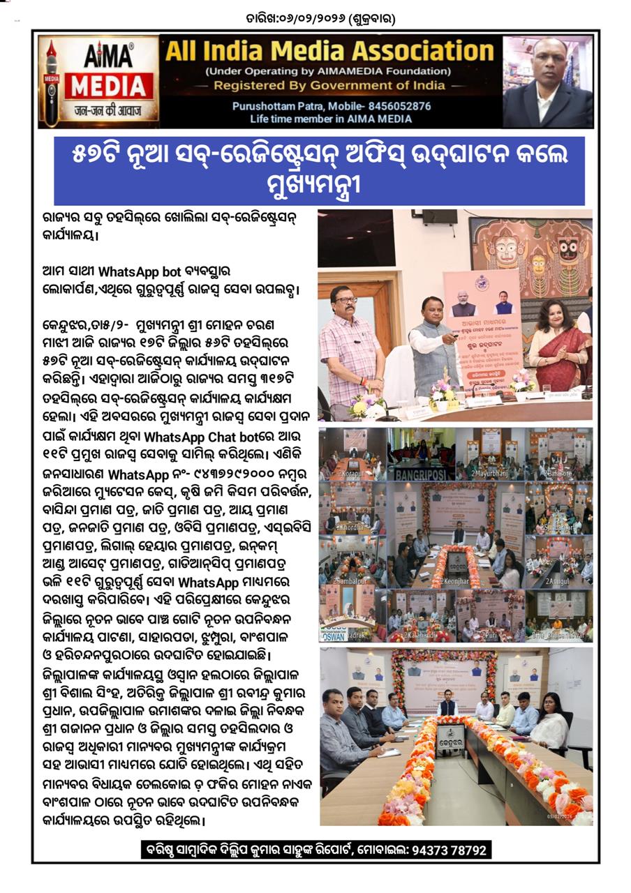 କେନ୍ଦୁଝର,ତା୫/୨- ମୁଖ୍ୟମନ୍ତ୍ରୀ ଶ୍ରୀ ମୋହନ ଚରଣ ମାଝୀ ଆଜି ରାଜ୍ୟର ୧୭ଟି ଜିଲ୍ଲାର ୫୬ଟି ତହସିଲ୍ରେ ୫୭ଟି ନୂଆ ସବ୍-ରେଜିଷ୍ଟ୍ରେସନ୍ କାର୍ଯ୍ୟାଳୟ ଉଦ୍ଘାଟନ କରିଛନ୍ତି। ଏହାଦ୍ବାରା ଆଜିଠାରୁ ରାଜ୍ୟର ସମସ୍ତ ୩୧୭ଟି ତହସିଲ୍ରେ ସବ୍-ରେଜିଷ୍ଟ୍ରେସନ୍ କାର୍ଯ୍ୟାଳୟ କାର୍ଯ୍ୟକ୍ଷମ ହେଲା। ଏହି ଅବସରରେ ମୁଖ୍ୟମନ୍ତ୍ରୀ ରାଜସ୍ବ ସେବା ପ୍ରଦାନ ପାଇଁ କାର୍ଯ୍ୟକ୍ଷମ ଥିବା WhatsApp Chat botରେ ଆଉ ୧୧ଟି ପ୍ରମୁଖ ରାଜସ୍ବ ସେବାକୁ ସାମିଲ୍ କରିଥିଲେ। ଏଣିକି ଜନସାଧାରଣ WhatsApp ନଂ-୯୪୩୭୨୯୨୦୦୦ ନମ୍ବର ଜରିଆରେ ମ୍ୟୁଟେସନ କେସ୍, କୃଷି ଜମି କିସମ ପରିବର୍ତ୍ତନ, ବାସିନ୍ଦା ପ୍ରମାଣ ପତ୍ର, ଜାତି ପ୍ରମାଣ ପତ୍ର, ଆୟ ପ୍ରମାଣ ପତ୍ର, ଜନଜାତି ପ୍ରମାଣ ପତ୍ର, ଓବିସି ପ୍ରମାଣପତ୍ର, ଏସ୍ଇବିସି ପ୍ରମାଣପତ୍ର, ଲିଗାଲ୍ ହେୟାର ପ୍ରମାଣପତ୍ର, ଇନ୍କମ୍ ଆଣ୍ଡ ଆସେଟ୍ ପ୍ରମାଣପତ୍ର, ଗାଡିଆନ୍ସିପ୍ ପ୍ରମାଣପତ୍ର ଭଳି ୧୧ଟି ଗୁରୁତ୍ବପୂର୍ଣ୍ଣ ସେବା WhatsApp ମାଧ୍ୟମରେ ଦରଖାସ୍ତ କରିପାରିବେ। ଏହି ପରିପ୍ରେକ୍ଷୀରେ କେନ୍ଦୁଝର ଜିଲ୍ଲାରେ ନୂତନ ଭାବେ ପାଞ୍ଚ ଗୋଟି ନୂତନ ଉପନିବନ୍ଧନ କାର୍ଯ୍ୟାଳୟ ପାଟଣା, ସାହାରପଡା, ଝୁମ୍ପୁରା, ବାଂଶପାଳ ଓ ହରିଚନ୍ଦନପୁରଠାରେ ଉଦଘାଟିତ ହୋଇଯାଇଛି। ଜିଲ୍ଲାପାଳଙ୍କ କାର୍ଯ୍ୟାଳୟସ୍ଥ ଓସ୍ଵାନ ହଲଠାରେ ଜିଲ୍ଲାପାଳ ଶ୍ରୀ ବିଶାଲ ସିଂହ, ଅତିରିକ୍ତ ଜିଲ୍ଲାପାଳ ଶ୍ରୀ ରବୀନ୍ଦ୍ର କୁମାର ପ୍ରଧାନ, ଉପଜିଲ୍ଲାପାଳ ଉମାଶଙ୍କର ଦଳାଇ ଜିଲ୍ଲା ନିବନ୍ଧକ ଶ୍ରୀ ଗଜାନନ ପ୍ରଧାନ ଓ ଜିଲ୍ଲାର ସମସ୍ତ ତହସିଲଦାର ଓ ରାଜସ୍ଵ ଅଧିକାରୀ ମାନ୍ୟବର ମୁଖ୍ୟମନ୍ତ୍ରୀଙ୍କ କାର୍ଯ୍ୟକ୍ରମ ସହ ଆଭାସୀ ମାଧ୍ୟମରେ ଯୋଡି ହୋଇଥିଲେ। ଏଥି ସହିତ ମାନ୍ୟବର ବିଧାୟକ ତେଲକୋଇ ଡ଼ ଫକିର ମୋହନ ନାଏକ ବାଂଶପାଳ ଠାରେ ନୂତନ ଭାବେ ଉଦଘାଟିତ ଉପନିବନ୍ଧକ କାର୍ଯ୍ୟାଳୟରେ ଉପସ୍ଥିତ ରହିଥିଲେ।