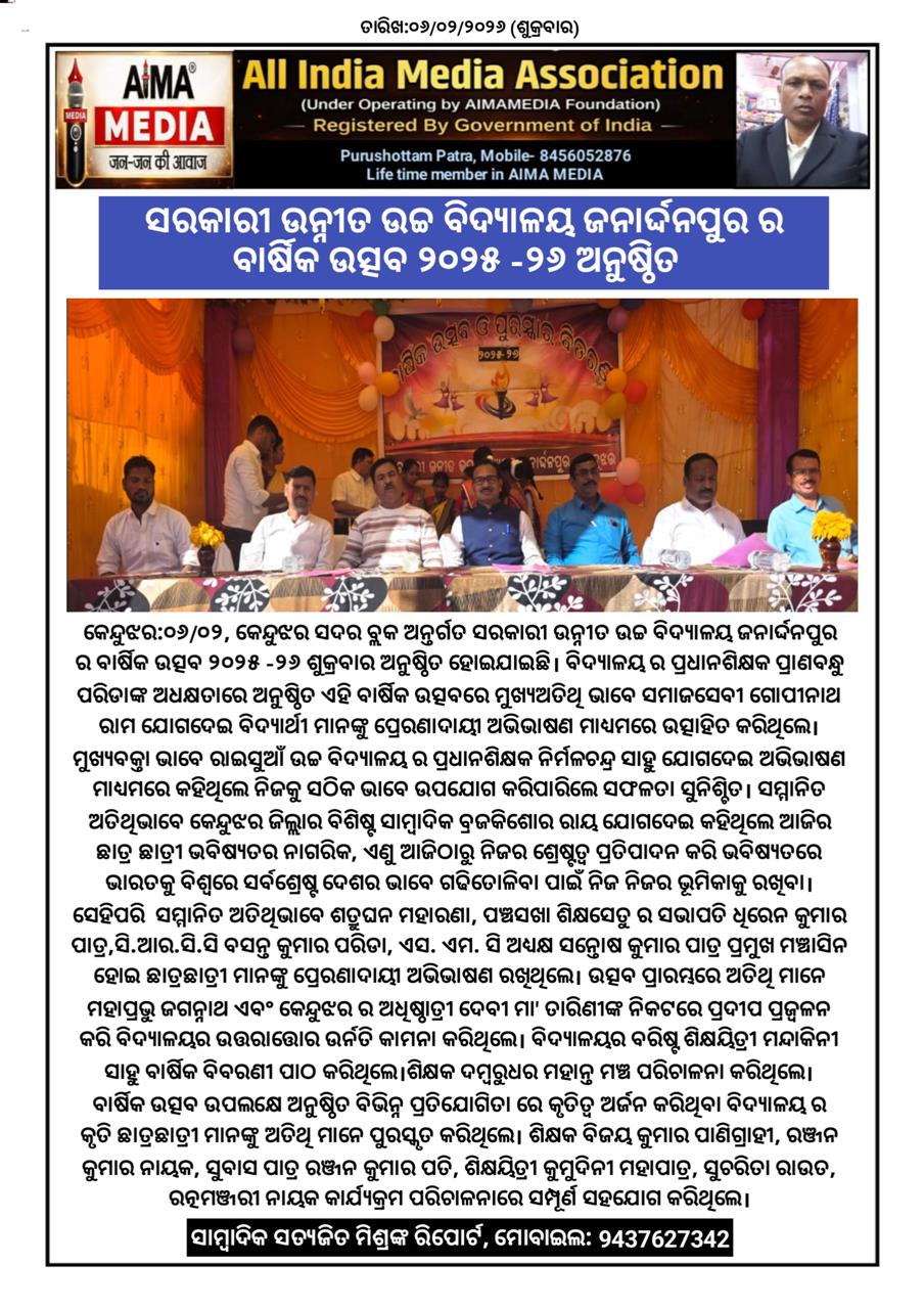ସରକାରୀ ଉନ୍ନୀତ ଉଚ୍ଚ ବିଦ୍ୟାଳୟ ଜନାର୍ଦ୍ଦନପୁର ର ବାର୍ଷିକ ଉତ୍ସବ ୨୦୨୫ -୨୬ ଅନୁଷ୍ଠିତ।