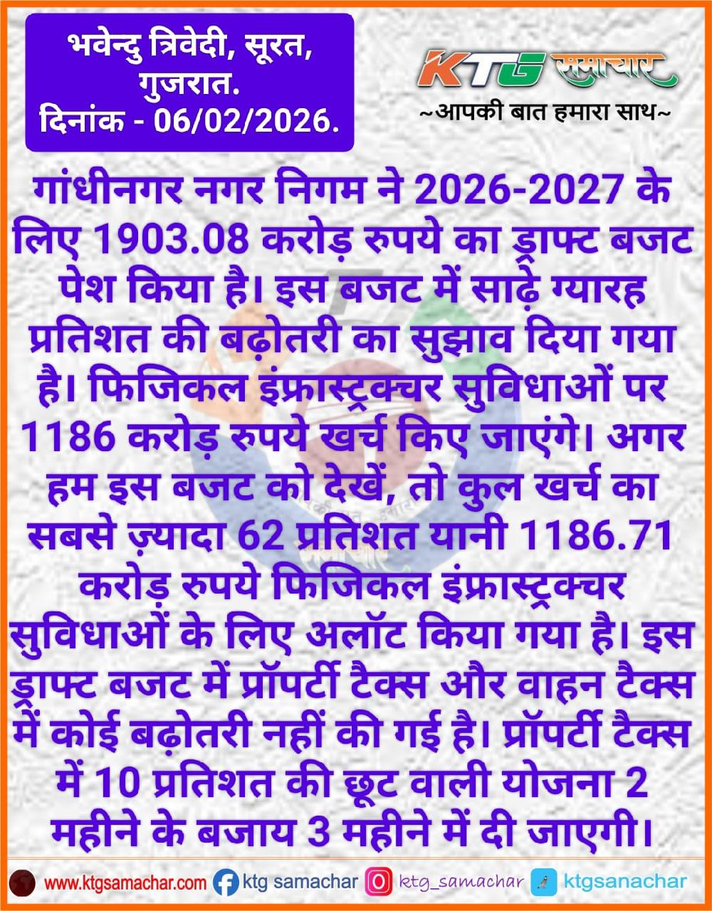 गांधीनगर नगर निगम ने 2026-27 के लिए 1903.08 करोड रुपए का ड्राफ्ट बजट पेश किया है।