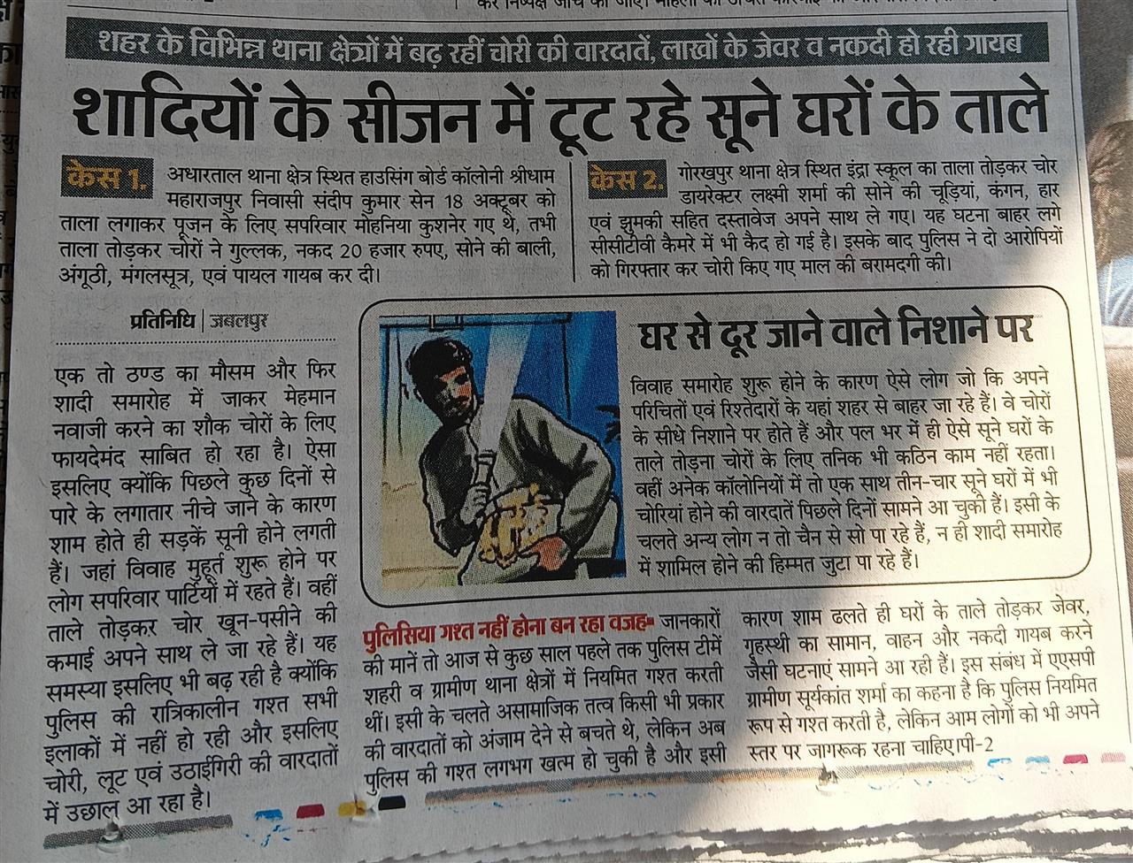 शहर के विभिन्न थाना क्षेत्र में बढ़ रही चोरी की वारदात लाखों के जेवर व नकदी रहो रही गायब