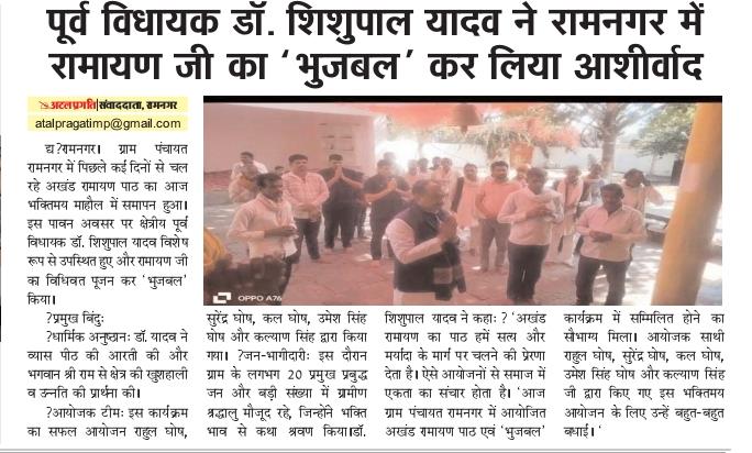 रामनगर। ग्राम पंचायत रामनगर में पिछले कई दिनों से चल रहे अखंड रामायण पाठ का आज भक्तिमय माहौल में समापन हुआ। इस पावन अवसर पर क्षेत्रीय पूर्व विधायक डॉ. शिशुपाल यादव विशेष रूप से उपस्थित हुए और रामायण जी का विधिवत पूजन कर 'भुजबल' किया।