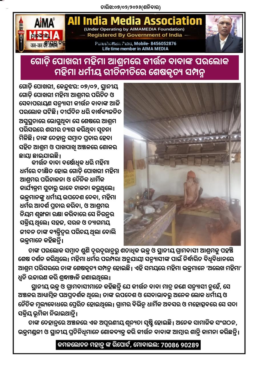 ଗୋଡ଼ି ପୋଖରୀ ମହିମା ଆଶ୍ରମରେ କୀର୍ତ୍ତନ ବାବାଙ୍କ ପରଲୋକ ମହିମା ଧର୍ମୀୟ ରୀତିନୀତିରେ ଶେଷକୃତ୍ୟ ସମ୍ପନ୍ନ।
