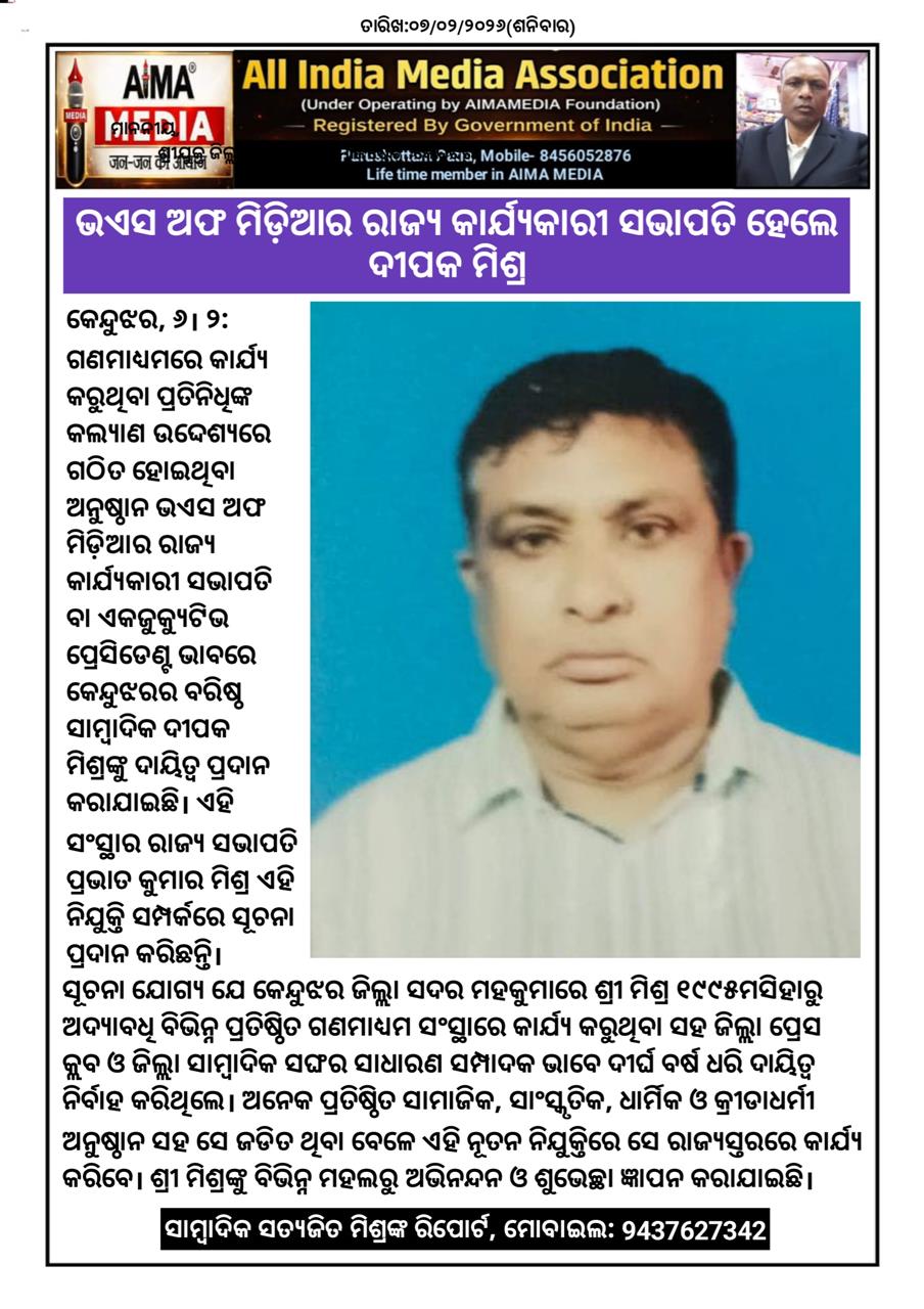 କେନ୍ଦୁଝର, ୬। ୨: ଗଣମାଧ୍ୟମରେ କାର୍ଯ୍ୟ କରୁଥିବା ପ୍ରତିନିଧିଙ୍କ କଲ୍ୟାଣ ଉଦ୍ଦେଶ୍ୟରେ ଗଠିତ ହୋଇଥିବା ଅନୁଷ୍ଠାନ ଭଏସ ଅଫ ମିଡ଼ିଆର ରାଜ୍ୟ କାର୍ଯ୍ୟକାରୀ ସଭାପତି ବା ଏକଜୁକ୍ୟୁଟିଭ ପ୍ରେସିଡେଣ୍ଟ ଭାବରେ କେନ୍ଦୁଝରର ବରିଷ୍ଠ ସାମ୍ବାଦିକ ଦୀପକ ମିଶ୍ରଙ୍କୁ ଦାୟିତ୍ୱ ପ୍ରଦାନ କରାଯାଇଛି। ଏହି ସଂସ୍ଥାର ରାଜ୍ୟ ସଭାପତି ପ୍ରଭାତ କୁମାର ମିଶ୍ର ଏହି ନିଯୁକ୍ତି ସମ୍ପର୍କରେ ସୂଚନା ପ୍ରଦାନ କରିଛନ୍ତି। ସୂଚନା ଯୋଗ୍ୟ ଯେ କେନ୍ଦୁଝର ଜିଲ୍ଲା ସଦର ମହକୁମାରେ ଶ୍ରୀ ମିଶ୍ର ୧୯୯୫ମସିହାରୁ ଅଦ୍ୟାବଧି ବିଭିନ୍ନ ପ୍ରତିଷ୍ଠିତ ଗଣମାଧ୍ୟମ ସଂସ୍ଥାରେ କାର୍ଯ୍ୟ କରୁଥିବା ସହ ଜିଲ୍ଲା ପ୍ରେସ କ୍ଲବ ଓ ଜିଲ୍ଲା ସାମ୍ବାଦିକ ସଙ୍ଘର ସାଧାରଣ ସମ୍ପାଦକ ଭାବେ ଦୀର୍ଘ ବର୍ଷ ଧରି ଦାୟିତ୍ୱ ନିର୍ବାହ କରିଥିଲେ। ଅନେକ ପ୍ରତିଷ୍ଠିତ ସାମାଜିକ, ସାଂସ୍କୃତିକ, ଧାର୍ମିକ ଓ କ୍ରୀଡାଧର୍ମୀ ଅନୁଷ୍ଠାନ ସହ ସେ ଜଡିତ ଥିବା ବେଳେ ଏହି ନୂତନ ନିଯୁକ୍ତିରେ ସେ ରାଜ୍ୟସ୍ତରରେ କାର୍ଯ୍ୟ କରିବେ। ଶ୍ରୀ ମିଶ୍ରଙ୍କୁ ବିଭିନ୍ନ ମହଲରୁ ଅଭିନନ୍ଦନ ଓ ଶୁଭେଚ୍ଛା ଜ୍ଞାପନ କରାଯାଇଛି।