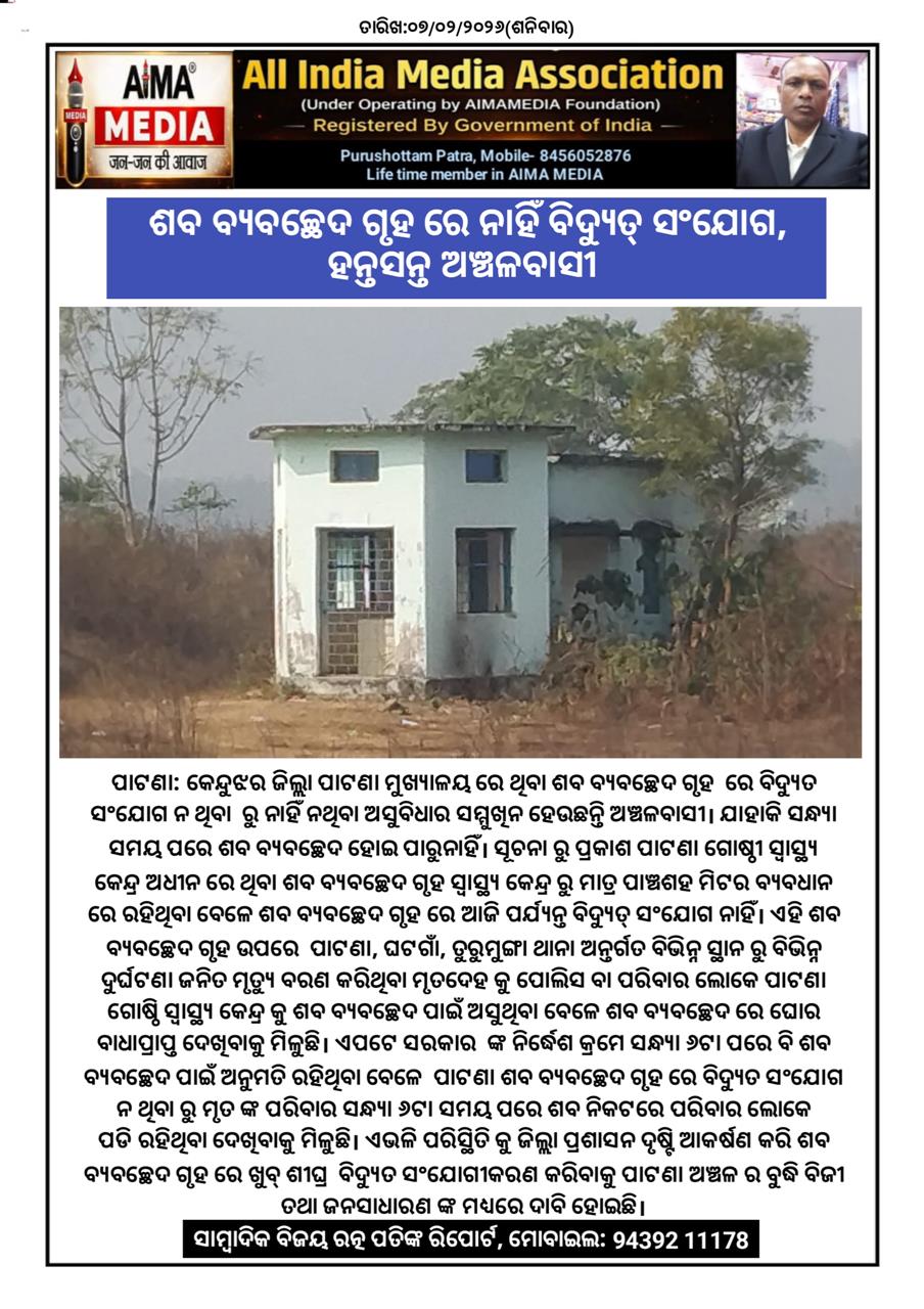 ପାଟଣା: କେନ୍ଦୁଝର ଜିଲ୍ଲା ପାଟଣା ମୁଖ୍ୟାଳୟ ରେ ଥିବା ଶବ ବ୍ୟବଚ୍ଛେଦ ଗୃହ ରେ ବିଦ୍ୟୁତ ସଂଯୋଗ ନ ଥିବା ରୁ ନାହିଁ ନଥିବା ଅସୁବିଧାର ସମ୍ମୁଖିନ ହେଉଛନ୍ତି ଅଞ୍ଚଳବାସୀ । ଯାହାକି ସନ୍ଧ୍ୟା ସମୟ ପରେ ଶବ ବ୍ୟବଚ୍ଛେଦ ହୋଇ ପାରୁନାହିଁ। ସୂଚନା ରୁ ପ୍ରକାଶ ପାଟଣା ଗୋଷ୍ଠୀ ସ୍ବାସ୍ଥ୍ୟ କେନ୍ଦ୍ର ଅଧୀନ ରେ ଥିବା ଶବ ବ୍ୟବଚ୍ଛେଦ ଗୃହ ସ୍ବାସ୍ଥ୍ୟ କେନ୍ଦ୍ର ରୁ ମାତ୍ର ପାଞ୍ଚଶହ ମିଟର ବ୍ୟବଧାନ ରେ ରହିଥିବା ବେଳେ ଶବ ବ୍ୟବଚ୍ଛେଦ ଗୃହ ରେ ଆଜି ପର୍ଯ୍ୟନ୍ତ ବିଦ୍ୟୁତ୍ ସଂଯୋଗ ନାହିଁ। ଏହି ଶବ ବ୍ୟବଚ୍ଛେଦ ଗୃହ ଉପରେ ପାଟଣା, ଘଟଗାଁ, ତୁରୁମୁଙ୍ଗା ଥାନା ଅନ୍ତର୍ଗତ ବିଭିନ୍ନ ସ୍ଥାନ ରୁ ବିଭିନ୍ନ ଦୁର୍ଘଟଣା ଜନିତ ମୃତ୍ୟୁ ବରଣ କରିଥିବା ମୃତଦେହ କୁ ପୋଲିସ ବା ପରିବାର ଲୋକେ ପାଟଣା ଗୋଷ୍ଠି ସ୍ବାସ୍ଥ୍ୟ କେନ୍ଦ୍ର କୁ ଶବ ବ୍ୟବଚ୍ଛେଦ ପାଇଁ ଅସୁଥିବା ବେଳେ ଶବ ବ୍ୟବଚ୍ଛେଦ ରେ ଘୋର ବାଧାପ୍ରାପ୍ତ ଦେଖିବାକୁ ମିଳୁଛି। ଏପଟେ ସରକାର ଙ୍କ ନିର୍ଦ୍ଧେଶ କ୍ରମେ ସନ୍ଧ୍ୟା ୬ଟା ପରେ ବି ଶବ ବ୍ୟବଚ୍ଛେଦ ପାଇଁ ଅନୁମତି ରହିଥିବା ବେଳେ ପାଟଣା ଶବ ବ୍ୟବଚ୍ଛେଦ ଗୃହ ରେ ବିଦ୍ୟୁତ ସଂଯୋଗ ନ ଥିବା ରୁ ମୃତ ଙ୍କ ପରିବାର ସନ୍ଧ୍ୟା ୬ଟା ସମୟ ପରେ ଶବ ନିକଟରେ ପରିବାର ଲୋକେ ପଡି ରହିଥିବା ଦେଖିବାକୁ ମିଳୁଛି । ଏଭଳି ପରିସ୍ଥିତି କୁ ଜିଲ୍ଲା ପ୍ରଶାସନ ଦୃଷ୍ଟି ଆକର୍ଷଣ କରି ଶବ ବ୍ୟବଚ୍ଛେଦ ଗୃହ ରେ ଖୁବ୍ ଶୀଘ୍ର ବିଦ୍ୟୁତ ସଂଯୋଗୀକରଣ କରିବାକୁ ପାଟଣା ଅଞ୍ଚଳ ର ବୁଦ୍ଧି ବିଜୀ ତଥା ଜନସାଧାରଣ ଙ୍କ ମଧ୍ୟରେ ଦାବି ହୋଇଛି।