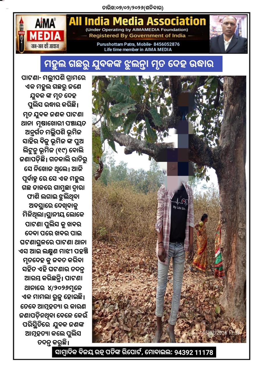ପାଟଣା-ମଲ୍ଲୀପଶି ଗ୍ରାମରେ ଏକ ମହୁଲ ଗଛରୁ ଜଣେ ଯୁବକ ଙ୍କ ମୃତ ଦେହ ପୁଲିସ ଉଦ୍ଧାର କରିଛି।ମୃତ ଯୁବକ ଜଣକ ପାଟଣା ଥାନା ମୂଷାଖୋରୀ ପଞ୍ଚାୟତ ଅନ୍ତର୍ଗତ ମଲ୍ଲିପଶି ଭୂମିଜ ସାହିର ବିଜୁ ଭୂମିଜ ଙ୍କ ପୁଅ ଲିଟୁନୁ ଭୂମିଜ (୧୯) ବୋଲି ଜଣାପଡ଼ିଛି। ଗତକାଲି ରାତିରୁ ସେ ନିଖୋଜ ଥିଲେ।ଆଜି ପୂର୍ବାହ୍ନ ରେ ସେ ଏକ ମହୁଲ ଗଛ ଡାଳରେ ଗାମୁଛା ଦ୍ୱାରା ଫାଶି ଲଗାଇ ଝୁଲିଥିବା ଅବସ୍ଥାରେ ଦେଖିବାକୁ ମିଳିଥିଲା। ସ୍ଥାନୀୟ ଲୋକେ ପାଟଣା ପୁଲିସ କୁ ଖବର ଦେବା ପରେ ଖବର ପାଇ ଘଟଣାସ୍ଥଳରେ ପାଟଣା ଥାନା ଏସ ଆଇ ଲକ୍ଷ୍ମଣ ମାଝୀ ପହଞ୍ଚି ମୃତଦେହ କୁ ଜବତ କରିବା ସହିତ ଏହି ଘଟଣାର ତଦନ୍ତ ଆରମ୍ଭ କରିଛନ୍ତି। ପାଟଣା ଥାନାରେ ୪/୨୦୨୬ମୂଳେ ଏକ ମାମଲା ରୁଜୁ ହୋଇଛି। ତେବେ ଆତ୍ମହତ୍ୟା ର କାରଣ ଜଣାପଡ଼ିନଥିବା ବେଳେ କେଉଁ ପରିସ୍ଥିତିରେ ଯୁବକ ଜଣଙ୍କ ଆତ୍ମହତ୍ୟା କଲେ ପୁଲିସ ତଦନ୍ତ କରୁଛି।