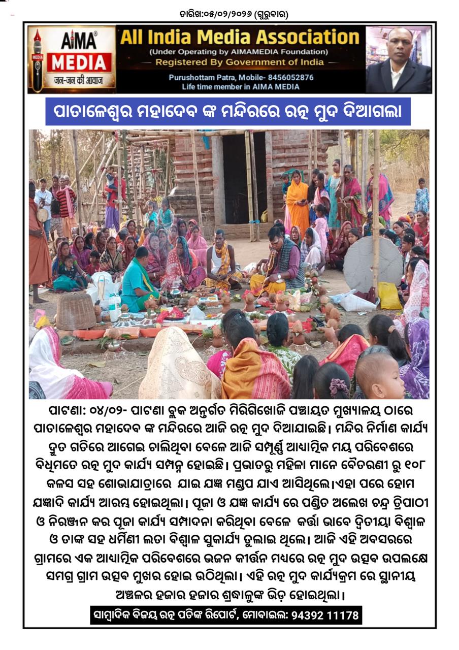 ପାଟଣା- ପାଟଣା ବ୍ଲକ ଅନ୍ତର୍ଗତ ମିରିଗିଖୋଜି ପଞ୍ଚାୟତ ମୁଖ୍ୟାଳୟ ଠାରେ ପାତାଳେଶ୍ୱର ମହାଦେବ ଙ୍କ ମନ୍ଦିରରେ ଆଜି ରତ୍ନ ମୁଦ ଦିଆଯାଇଛି। ମନ୍ଦିର ନିର୍ମାଣ କାର୍ଯ୍ୟ ଦ୍ରୁତ ଗତିରେ ଆଗେଇ ଚାଲିଥିବା ବେଳେ ଆଜି ସମ୍ପୂର୍ଣ୍ଣ ଆଧ୍ୟାତ୍ମିକ ମୟ ପରିବେଶରେ ବିଧିମତେ ରତ୍ନ ମୁଦ କାର୍ଯ୍ୟ ସମ୍ପନ୍ନ ହୋଇଛି। ପ୍ରଭାତରୁ ମହିଳା ମାନେ ବୈତରଣୀ ରୁ 108 କଳସ ସହ ଶୋଭାଯାତ୍ରାରେ ଯାଇ ଯଜ୍ଞ ମଣ୍ଡପ ଯାଏ ଆସିଥିଲେ। ଏହା ପରେ ହୋମ ଯଜ୍ଞାଦି କାର୍ଯ୍ୟ ଆରମ୍ଭ ହୋଇଥିଲା। ପୂଜା ଓ ଯଜ୍ଞ କାର୍ଯ୍ୟ ରେ ପଣ୍ଡିତ ଅଲେଖ ଚନ୍ଦ୍ର ତ୍ରିପାଠୀ ଓ ନିରଞ୍ଜନ କର ପୂଜା କାର୍ଯ୍ୟ ସମ୍ପାଦନା କରିଥିବା ବେଳେ କର୍ତ୍ତା ଭାବେ ଦ୍ଵିତୀୟା ବିଶ୍ୱାଳ ଓ ତାଙ୍କ ସହ ଧର୍ମିଣୀ ଲତା ବିଶ୍ୱାଳ ସୁକାର୍ଯ୍ୟ ତୁଲାଇ ଥିଲେ। ଆଜି ଏହି ଅବସରରେ ଗ୍ରାମରେ ଏକ ଆଧ୍ୟାତ୍ମିକ ପରିବେଶରେ ଭଜନ କୀର୍ତ୍ତନ ମଧ୍ୟରେ ରତ୍ନ ମୁଦ ଉତ୍ସଵ ଉପଲକ୍ଷେ ସମଗ୍ର ଗ୍ରାମ ଉତ୍ସଵ ମୁଖର ହୋଇ ଉଠିଥିଲା। ଏହି ରତ୍ନ ମୁଦ କାର୍ଯ୍ୟକ୍ରମ ରେ ସ୍ଥାନୀୟ ଅଞ୍ଚଳର ହଜାର ହଜାର ଶ୍ରଦ୍ଧାଳୁଙ୍କ ଭିଡ଼ ହୋଇଥିଲା।