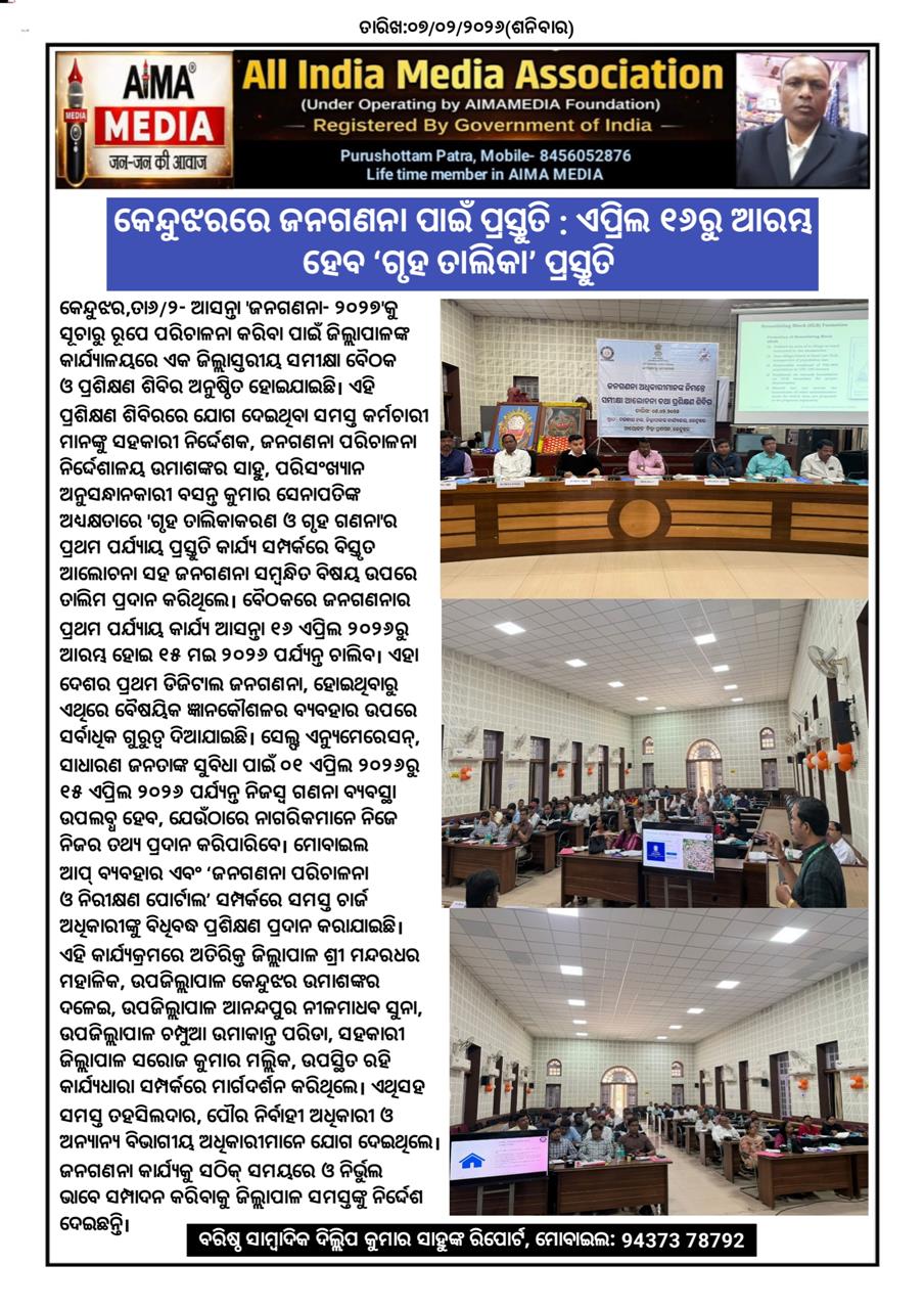କେନ୍ଦୁଝର, ତା୬/୨- ଆସନ୍ତା 'ଜନଗଣନା- ୨୦୨୭'କୁ ସୂଚାରୁ ରୂପେ ପରିଚାଳନା କରିବା ପାଇଁ ଜିଲ୍ଲାପାଳଙ୍କ କାର୍ଯ୍ୟାଳୟରେ ଏକ ଜିଲ୍ଲାସ୍ତରୀୟ ସମୀକ୍ଷା ବୈଠକ ଓ ପ୍ରଶିକ୍ଷଣ ଶିବିର ଅନୁଷ୍ଠିତ ହୋଇଯାଇଛି । ଏହି ପ୍ରଶିକ୍ଷଣ ଶିବିରରେ ଯୋଗ ଦେଇଥିବା ସମସ୍ତ କର୍ମଚାରୀ ମାନଙ୍କୁ ସହକାରୀ ନିର୍ଦ୍ଦେଶକ, ଜନଗଣନା ପରିଚାଳନା ନିର୍ଦ୍ଦେଶାଳୟ ଉମାଶଙ୍କର ସାହୁ, ପରିସଂଖ୍ୟାନ ଅନୁସନ୍ଧାନକାରୀ ବସନ୍ତ କୁମାର ସେନାପତିଙ୍କ ଅଧ୍ୟକ୍ଷତାରେ 'ଗୃହ ତାଲିକାକରଣ ଓ ଗୃହ ଗଣନା'ର ପ୍ରଥମ ପର୍ଯ୍ୟାୟ ପ୍ରସ୍ତୁତି କାର୍ଯ୍ୟ ସମ୍ପର୍କରେ ବିସ୍ତୃତ ଆଲୋଚନା ସହ ଜନଗଣନା ସମ୍ବନ୍ଧିତ ବିଷୟ ଉପରେ ତାଲିମ ପ୍ରଦାନ କରିଥିଲେ। ବୈଠକରେ ଜନଗଣନାର ପ୍ରଥମ ପର୍ଯ୍ୟାୟ କାର୍ଯ୍ୟ ଆସନ୍ତା ୧୬ ଏପ୍ରିଲ ୨୦୨୬ରୁ ଆରମ୍ଭ ହୋଇ ୧୫ ମଇ ୨୦୨୬ ପର୍ଯ୍ୟନ୍ତ ଚାଲିବ । ଏହା ଦେଶର ପ୍ରଥମ ଡିଜିଟାଲ ଜନଗଣନା, ହୋଇଥିବାରୁ ଏଥିରେ ବୈଷୟିକ ଜ୍ଞାନକୌଶଳର ବ୍ୟବହାର ଉପରେ ସର୍ବାଧିକ ଗୁରୁତ୍ୱ ଦିଆଯାଇଛି। ସେଲ୍ଫ ଏନ୍ୟୁମେରେସନ୍, ସାଧାରଣ ଜନତାଙ୍କ ସୁବିଧା ପାଇଁ ୦୧ ଏପ୍ରିଲ ୨୦୨୬ରୁ ୧୫ ଏପ୍ରିଲ ୨୦୨୬ ପର୍ଯ୍ୟନ୍ତ ନିଜସ୍ୱ ଗଣନା ବ୍ୟବସ୍ଥା ଉପଲବ୍ଧ ହେବ, ଯେଉଁଠାରେ ନାଗରିକମାନେ ନିଜେ ନିଜର ତଥ୍ୟ ପ୍ରଦାନ କରିପାରିବେ। ମୋବାଇଲ ଆପ୍ ବ୍ୟବହାର ଏବଂ ‘ଜନଗଣନା ପରିଚାଳନା ଓ ନିରୀକ୍ଷଣ ପୋର୍ଟାଲ’ ସମ୍ପର୍କରେ ସମସ୍ତ ଚାର୍ଜ ଅଧିକାରୀଙ୍କୁ ବିଧିବଦ୍ଧ ପ୍ରଶିକ୍ଷଣ ପ୍ରଦାନ କରାଯାଇଛି। ଏହି କାର୍ଯ୍ୟକ୍ରମରେ ଅତିରିକ୍ତ ଜିଲ୍ଲାପାଳ ଶ୍ରୀ ମନ୍ଦରଧର ମହାଳିକ, ଉପଜିଲ୍ଲାପାଳ କେନ୍ଦୁଝର ଉମାଶଙ୍କର ଦଳେଇ, ଉପଜିଲ୍ଲାପାଳ ଆନନ୍ଦପୁର ନୀଳମାଧଵ ସୁନା, ଉପଜିଲ୍ଲାପାଳ ଚମ୍ପୁଆ ଉମାକାନ୍ତ ପରିଡା, ସହକାରୀ ଜିଲ୍ଲାପାଳ ସରୋଜ କୁମାର ମଲ୍ଲିକ, ଉପସ୍ଥିତ ରହି କାର୍ଯ୍ୟଧାରା ସମ୍ପର୍କରେ ମାର୍ଗଦର୍ଶନ କରିଥିଲେ। ଏଥିସହ ସମସ୍ତ ତହସିଲଦାର, ପୌର ନିର୍ବାହୀ ଅଧିକାରୀ ଓ ଅନ୍ୟାନ୍ୟ ବିଭାଗୀୟ ଅଧିକାରୀମାନେ ଯୋଗ ଦେଇଥିଲେ। ଜନଗଣନା କାର୍ଯ୍ୟକୁ ସଠିକ୍ ସମୟରେ ଓ ନିର୍ଭୁଲ ଭାବେ ସମ୍ପାଦନ କରିବାକୁ ଜିଲ୍ଲାପାଳ ସମସ୍ତଙ୍କୁ ନିର୍ଦ୍ଦେଶ ଦେଇଛନ୍ତି।