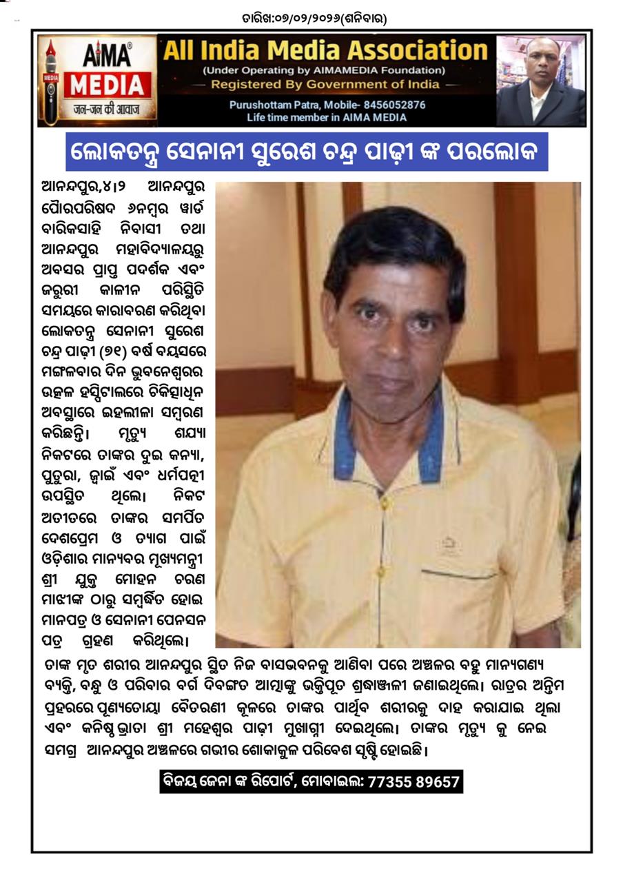 ଆନନ୍ଦପୁର,୪।୨ ଆନନ୍ଦପୁର ପୋୖରପରିଷଦ ୬ନମ୍ବର ୱାର୍ଡ ବାରିକସାହି ନିବାସୀ ତଥା ଆନନ୍ଦପୁର ମହାବିଦ୍ୟାଳୟରୁ ଅବସର ପ୍ରାପ୍ତ ପଦର୍ଶକ ଏବଂ ଜରୁରୀ କାଳୀନ ପରିସ୍ଥିତି ସମୟରେ କାରାବରଣ କରିଥିବା ଲୋକତନ୍ତ୍ର ସେନାନୀ ସୁରେଶ ଚନ୍ଦ୍ର ପାଢ଼ୀ (୭୧) ବର୍ଷ ବୟସରେ ମଙ୍ଗଳବାର ଦିନ ଭୁବନେଶ୍ଵରର ଉତ୍କଳ ହସ୍ପିଟାଲରେ ଚିକିତ୍ସାଧିନ ଅବସ୍ଥାରେ ଇହଲୀଳା ସମ୍ବରଣ କରିଛନ୍ତିି। ମୃତ୍ୟୁ ଶଯ୍ୟା ନିକଟରେ ତାଙ୍କର ଦୁଇ କନ୍ୟା, ପୁତୁରା, ଜ୍ୱାଇଁ ଏବଂ ଧର୍ମପତ୍ନୀ ଉପସ୍ଥିତ ଥିଲେ।ନିକଟ ଅତୀତରେ ତାଙ୍କର ସମର୍ପିତ ଦେଶପ୍ରେମ ଓ ତ୍ୟାଗ ପାଇଁ ଓଡ଼ିଶାର ମାନ୍ୟବର ମୂଖ୍ୟମନ୍ତ୍ରୀ ଶ୍ରୀ ଯୁକ୍ତ ମୋହନ ଚରଣ ମାଝୀଙ୍କ ଠାରୁ ସମ୍ବର୍ଦ୍ଧିତ ହୋଇ ମାନପତ୍ର ଓ ସେନାନୀ ପେନସନ ପତ୍ର ଗ୍ରହଣ କରିଥିଲେ। ତାଙ୍କ ମୃତ ଶରୀର ଆନନ୍ଦପୁର ସ୍ଥିତ ନିଜ ବାସଭବନକୁ ଆଣିବା ପରେ ଅଞ୍ଚଳର ବହୁ ମାନ୍ୟଗଣ୍ୟ ବ୍ୟକ୍ତି, ବନ୍ଧୁ ଓ ପରିବାର ବର୍ଗ ଦିବଙ୍ଗତ ଆତ୍ମାଙ୍କୁ ଭକ୍ତିପୂତ ଶ୍ରଦ୍ଧାଞ୍ଜଳୀ ଜଣାଇଥିଲେ। ରାତ୍ରର ଅନ୍ତିମ ପ୍ରହରରେ ପୂଣ୍ୟତୋୟା ବୈତରଣୀ କୂଳରେ ତାଙ୍କର ପାର୍ଥିବ ଶରୀରକୁ ଦାହ କରାଯାଇ ଥିଲା ଏବଂ କନିଷ୍ଠ ଭ୍ରାତା ଶ୍ରୀ ମହେଶ୍ୱର ପାଢ଼ୀ ମୁଖାଗ୍ନୀ ଦେଇଥିଲେ। ତାଙ୍କର ମୃତ୍ୟୁ କୁ ନେଇ ସମଗ୍ର ଆନନ୍ଦପୁର ଅଞ୍ଚଳରେ ଗଭୀର ଶୋକାକୁଳ ପରିବେଶ ସୃଷ୍ଟି ହୋଇଛି।