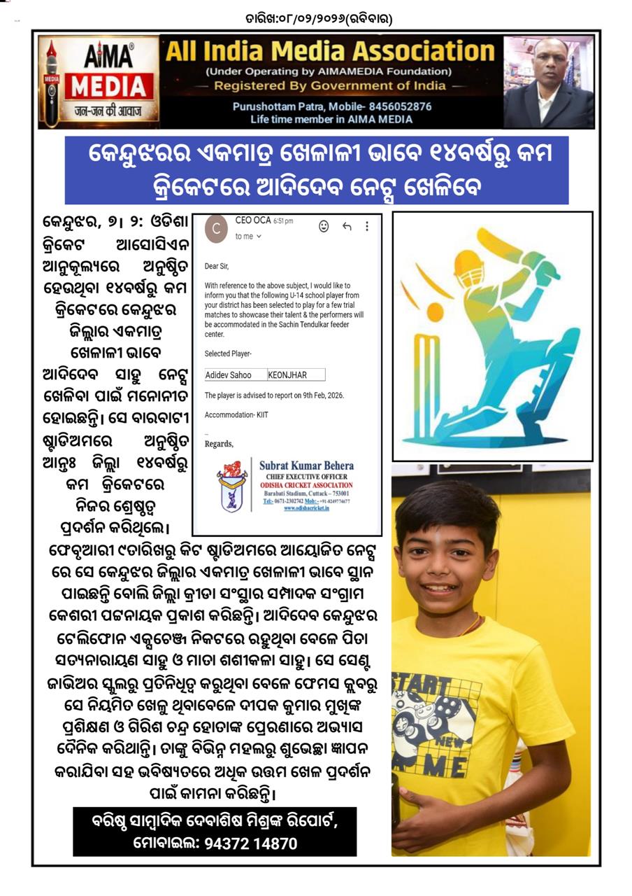 କେନ୍ଦୁଝର, ୭।୨: ଓଡିଶା କ୍ରିକେଟ ଆସୋସିଏନ ଆନୁକୂଲ୍ୟରେ ଅନୁଷ୍ଠିତ ହେଉଥିବା ୧୪ବର୍ଷରୁ କମ କ୍ରିକେଟରେ କେନ୍ଦୁଝର ଜିଲ୍ଲାର ଏକମାତ୍ର ଖେଳାଳୀ ଭାବେ ଆଦିଦେବ ସାହୁ ନେଟ୍ସ ଖେଳିବା ପାଇଁ ମନୋନୀତ ହୋଇଛନ୍ତି। ସେ ବାରବାଟୀ ଷ୍ଟାଡିଅମରେ ଅନୁଷ୍ଠିତ ଆନ୍ତଃ ଜିଲ୍ଲା ୧୪ବର୍ଷରୁ କମ କ୍ରିକେଟରେ ନିଜର ଶ୍ରେଷ୍ଠତ୍ବ ପ୍ରଦର୍ଶନ କରିଥିଲେ। ଫେବୃଆରୀ ୯ତାରିଖରୁ କିଟ ଷ୍ଟାଡିଅମରେ ଆୟୋଜିତ ନେଟ୍ସ ରେ ସେ କେନ୍ଦୁଝର ଜିଲ୍ଲାର ଏକମାତ୍ର ଖେଳାଳୀ ଭାବେ ସ୍ଥାନ ପାଇଛନ୍ତି ବୋଲି ଜିଲ୍ଲା କ୍ରୀଡା ସଂସ୍ଥାର ସମ୍ପାଦକ ସଂଗ୍ରାମ କେଶରୀ ପଟ୍ଟନାୟକ ପ୍ରକାଶ କରିଛନ୍ତି। ଆଦିଦେବ କେନ୍ଦୁଝର ଟେଲିଫୋନ ଏକ୍ସଚେଞ୍ଜ ନିକଟରେ ରହୁଥିବା ବେଳେ ପିତା ସତ୍ୟନାରାୟଣ ସାହୁ ଓ ମାତା ଶଶୀକଳା ସାହୁ। ସେ ସେଣ୍ଟ ଜାଭିଅର ସ୍କୁଲରୁ ପ୍ରତିନିଧିତ୍ବ କରୁଥିବା ବେଳେ ଫେମସ କ୍ଲବରୁ ସେ ନିୟମିତ ଖେଳୁ ଥିବାବେଳେ ଦୀପକ କୁମାର ମୁଖିଙ୍କ ପ୍ରଶିକ୍ଷଣ ଓ ଗିରିଶ ଚନ୍ଦ୍ର ହୋତାଙ୍କ ପ୍ରେରଣାରେ ଅଭ୍ୟାସ ଦୈନିକ କରିଥାନ୍ତି। ତାଙ୍କୁ ବିଭିନ୍ନ ମହଲରୁ ଶୁଭେଚ୍ଛା ଜ୍ଞାପନ କରାଯିବା ସହ ଭବିଷ୍ୟତରେ ଅଧିକ ଉତ୍ତମ ଖେଳ ପ୍ରଦର୍ଶନ ପାଇଁ କାମନା କରିଛନ୍ତି।