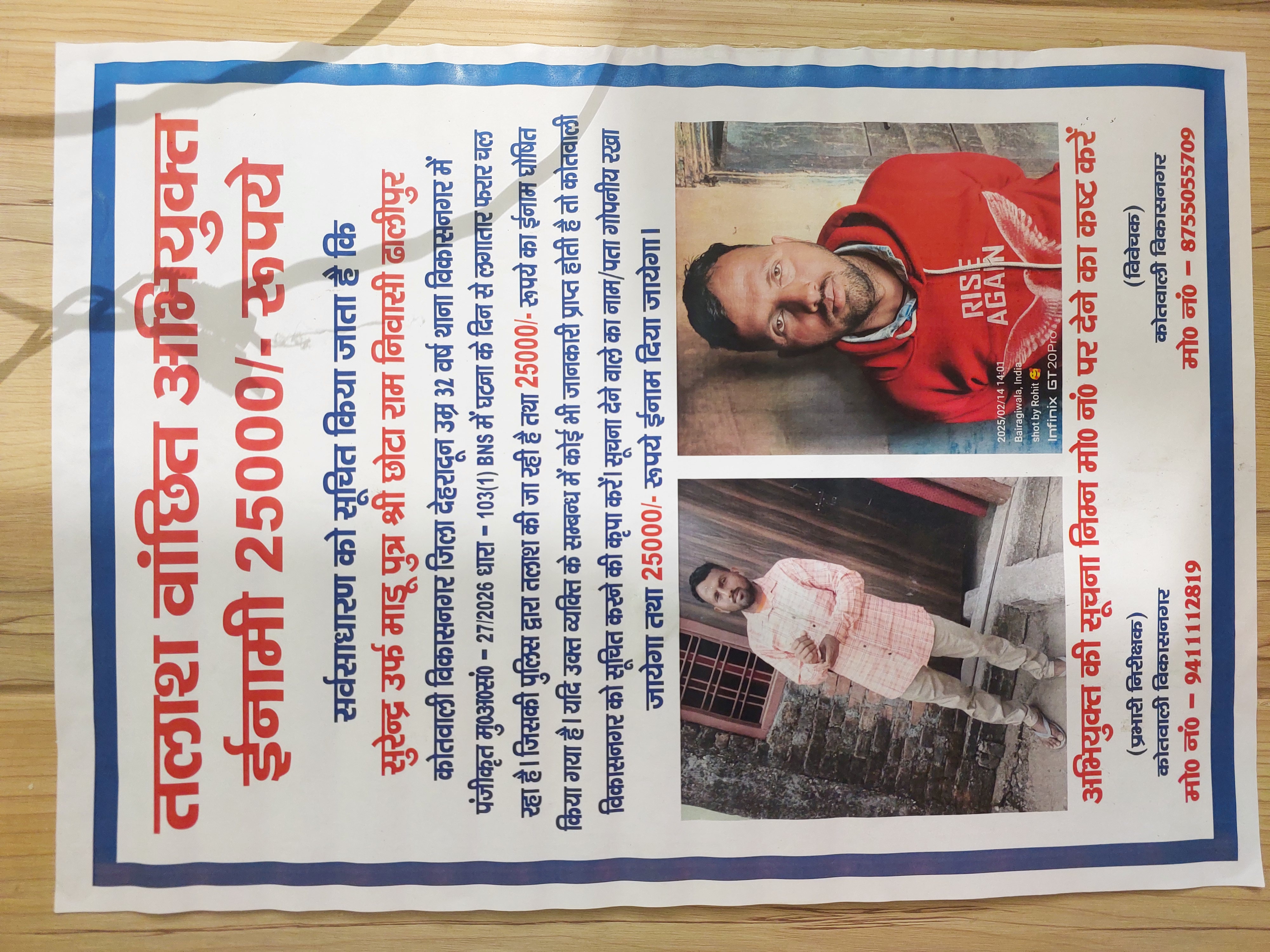 कोतवाली विकासनगर ने लोगों से अपील की है कि यदि आरोपी के बारे में कोई जानकारी प्राप्त हो तो गोपनीय रखते हुए तुरंत सूचित करें। सूचना देने वाले का नाम/पता गोपनीय रखा जाएगा और 25,000 रुपये का इनाम दिया जाएगा। संपर्क मोबाइल नंबर: 94111112819 (प्रभारी निरीक्षक) और 8755055709 (विवेचक)।