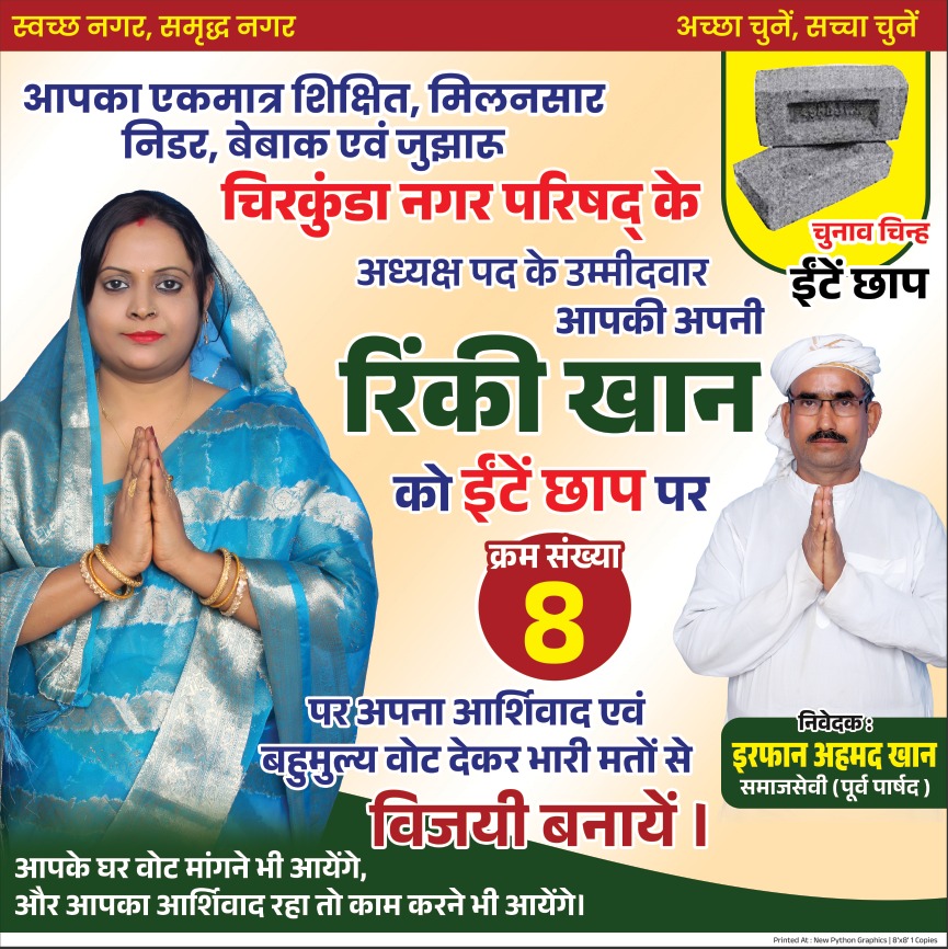 चिरकुंडा — "जिंदाबाद" के गगनभेदी नारों और "आपका अध्यक्ष कैसा हो? रिंकी खान जैसा हो!" की लयबद्ध गूंज के बीच, रिंकी खान ने चिरकुंडा अध्यक्ष पद के लिए अपनी दावेदारी पेश कर दी है। जहां अक्सर चुनाव विकास के वादों पर लड़े जाते हैं, वहीं रिंकी खान ने इस बार कंक्रीट की सड़कों से ज्यादा 'जज्बातों' और 'सहानुभूति' पर अपना दांव लगाया है।