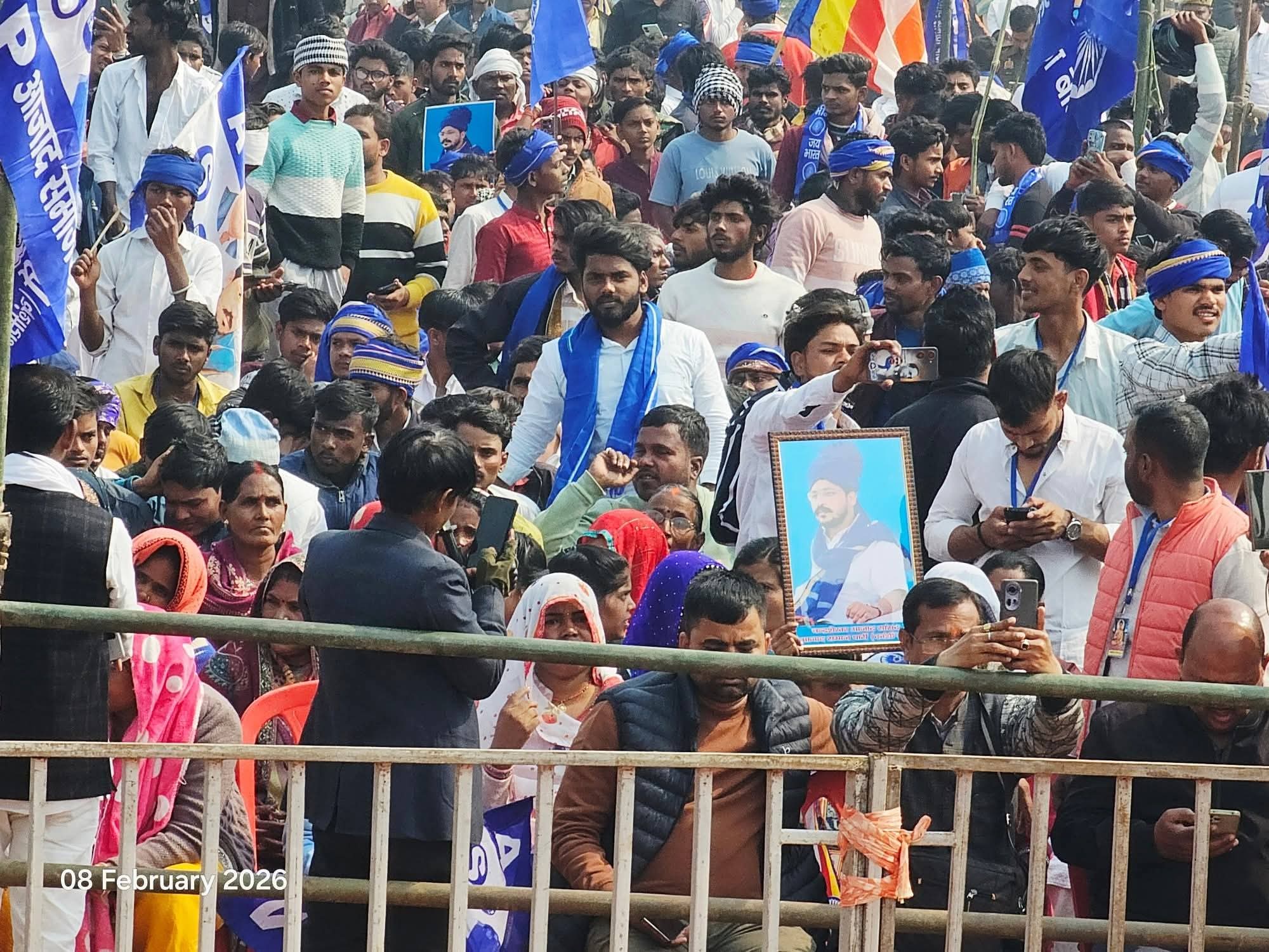 चंद्रशेखर आज़ाद के पहुंचते ही “जय भीम” और “संविधान बचाओ” के नारों से माहौल गूंज उठा। अपने संबोधन में उन्होंने सामाजिक न्याय, संविधान की रक्षा और दलित-पिछड़े वर्गों के अधिकारों पर जोर दिया।