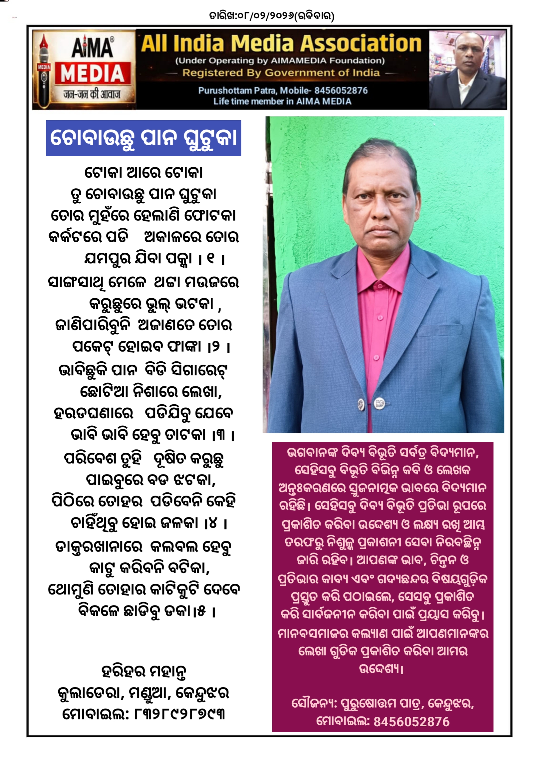 ଚୋବାଉଛୁ ପାନ ଘୁଟୁକା - ହରିହର ମହାନ୍ତ ଙ୍କ ଦ୍ଵାରା ରଚିତ କବିତା।