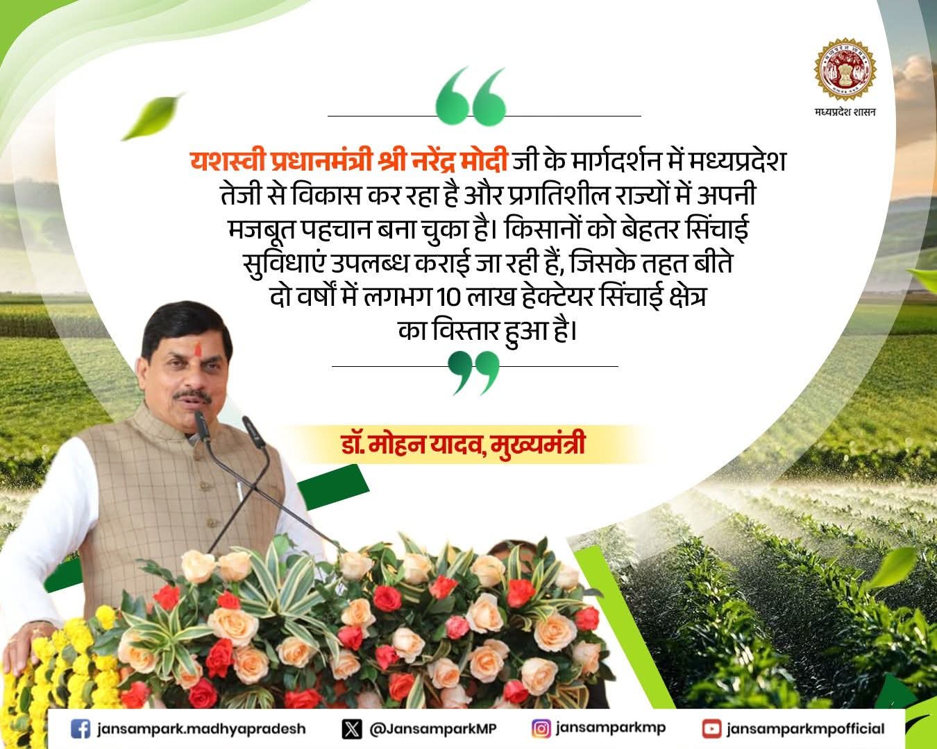 यशस्वी प्रधानमंत्री श्री नरेंद्र मोदी जी के मार्गदर्शन में मध्यप्रदेश तेजी से विकास कर रहा है और प्रगतिशील राज्यों में अपनी मजबूत पहचान बना चुका है। किसानों को बेहतर सिंचाई सुविधाएं उपलब्ध कराई जा रही हैं, जिसके तहत बीते दो वर्षों में लगभग 10 लाख हेक्टेयर सिंचाई क्षेत्र का विस्तार हुआ है।