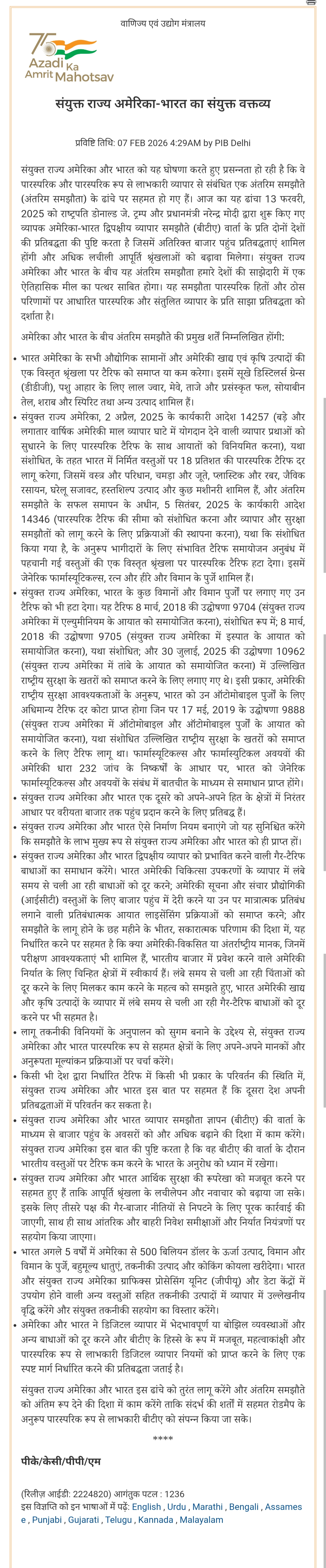 संयुक्त राज्य अमेरिका और भारत को यह घोषणा करते हुए प्रसन्नता हो रही है कि वे पारस्परिक और पारस्परिक रूप से लाभकारी व्यापार से संबंधित एक अंतरिम समझौते (अंतरिम समझौता) के ढांचे पर सहमत हो गए हैं। आज का यह ढांचा 13 फरवरी, 2025 को राष्ट्रपति डोनाल्ड जे. ट्रम्प और प्रधानमंत्री नरेन्‍द्र मोदी द्वारा शुरू किए गए व्यापक अमेरिका-भारत द्विपक्षीय व्यापार समझौते (बीटीए) वार्ता के प्रति दोनों देशों की प्रतिबद्धता की पुष्टि करता है जिसमें अतिरिक्त बाजार पहुंच प्रतिबद्धताएं शामिल होंगी और अधिक लचीली आपूर्ति श्रृंखलाओं को बढ़ावा मिलेगा। संयुक्त राज्य अमेरिका और भारत के बीच यह अंतरिम समझौता हमारे देशों की साझेदारी में एक ऐतिहासिक मील का पत्थर साबित होगा। यह समझौता पारस्परिक हितों और ठोस परिणामों पर आधारित पारस्परिक और संतुलित व्यापार के प्रति साझा प्रतिबद्धता को दर्शाता है।