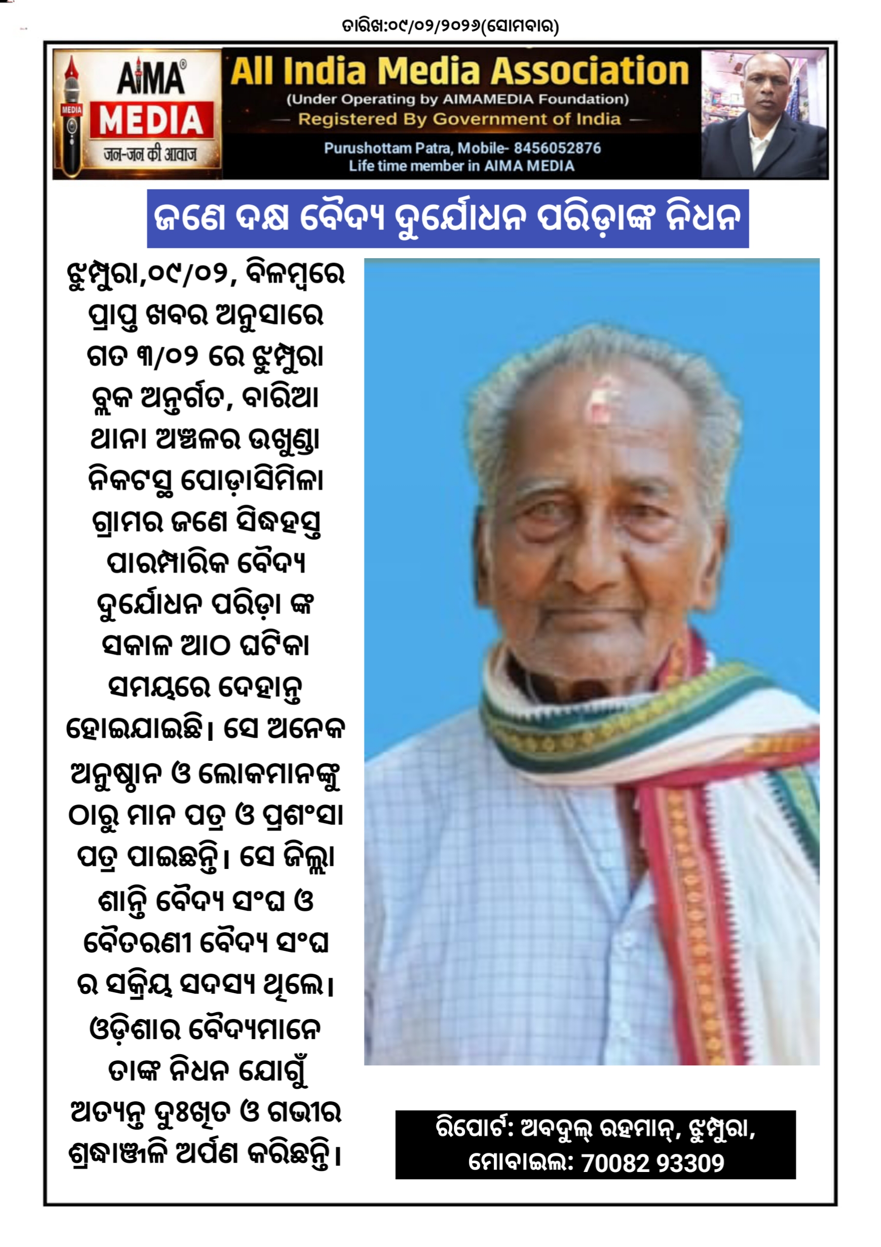 ଝୁମ୍ପୁ୍ରା,୦୮/୦୨/୨୦୨୬, ବିଳମ୍ବରେ ପ୍ରାପ୍ତ ଖବର ଅନୁସାରେ ଗତ ୩/୦୨ ରେ ଝୁମ୍ପୁରା ବ୍ଲକ ଅନ୍ତର୍ଗତ, ବାରିଆ ଥାନା ଅଞ୍ଚଳର ଉଖୁଣ୍ଡା ନିକଟସ୍ଥ ପୋଡ଼ାସିମିଳା ଗ୍ରାମର ଜଣେ ସିଦ୍ଧହସ୍ତ ପାରମ୍ପାରିକ ବୈଦ୍ୟ ଦୁର୍ଯୋଧନ ପରିଡ଼ା ଙ୍କ ସକାଳ ଆଠ ଘଟିକା ସମୟରେ ଦେହାନ୍ତ ହୋଇଯାଇଛି। ସେ ଅନେକ ଅନୁଷ୍ଠାନ ଓ ଲୋକମାନଙ୍କୁ ଠାରୁ ମାନ ପତ୍ର ଓ ପ୍ରଶଂସା ପତ୍ର ପାଇଛନ୍ତି। ସେ ଜିଲ୍ଲା ଶାନ୍ତି ବୈଦ୍ୟ ସଂଘ ଓ ବୈତରଣୀ ବୈଦ୍ୟ ସଂଘ ର ସକ୍ରିୟ ସଦସ୍ୟ ଥିଲେ। ଓଡ଼ିଶାର ବୈଦ୍ୟମାନେ ତାଙ୍କ ନିଧନ ଯୋଗୁଁ ଅତ୍ୟନ୍ତ ଦୁଃଖିତ ଓ ଗଭୀର ଶ୍ରଦ୍ଧାଜଂଳି ଅର୍ପଣ କରିଛନ୍ତି।
