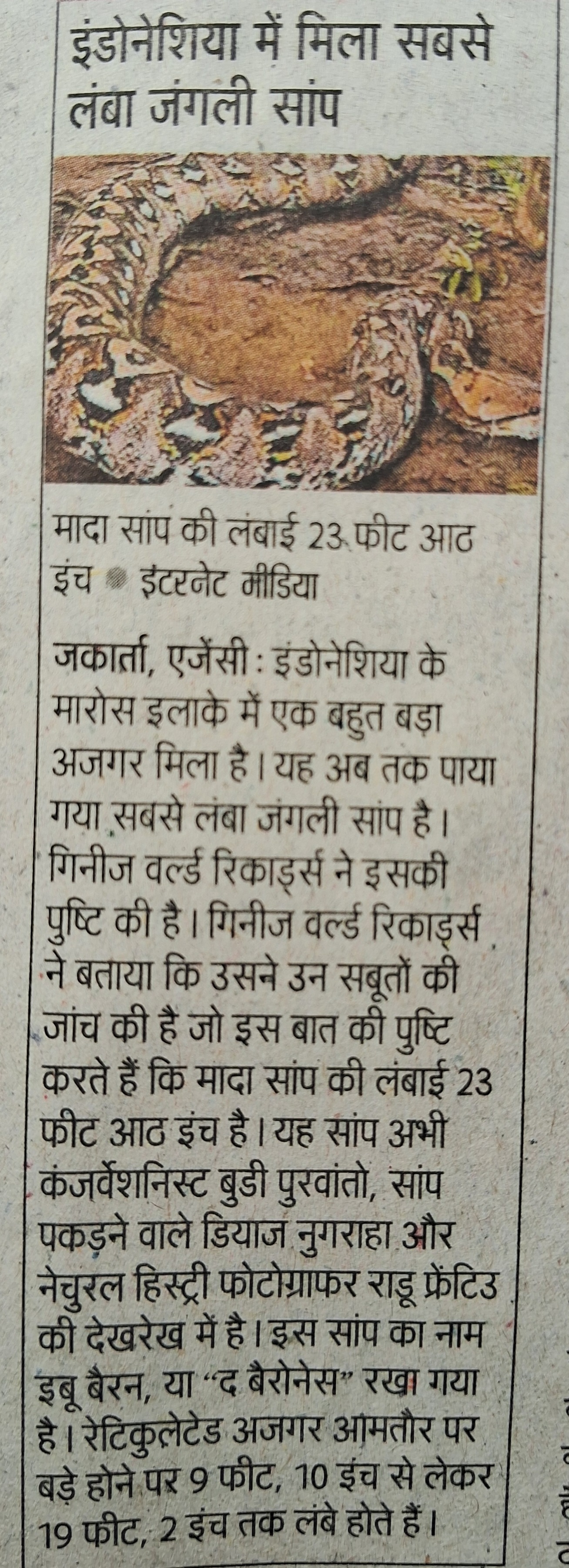 इंडोनेशिया के घने वर्षावनों से एक चौंकाने वाली खबर सामने आई है। स्थानीय वन विभाग और ग्रामीणों के अनुसार जंगल में अब तक का सबसे लंबा जंगली सांप देखा गया है, जिसे स्थानीय लोग ‘बिस्वुका’ नाम से पहचान रहे हैं। इस विशालकाय सांप की लंबाई असाधारण बताई जा रही है, जिसे देखकर वनकर्मी भी हैरान रह गए।