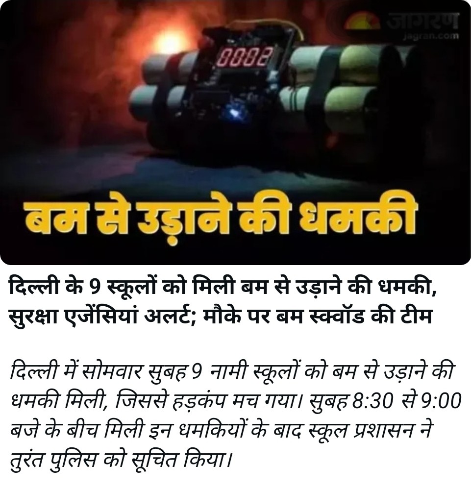 राजधानी दिल्ली में उस समय अफरा-तफरी मच गई जब दिल्ली के नौ स्कूलों को बम से उड़ाने की धमकी मिलने की सूचना सामने आई। धमकी मिलने के बाद संबंधित स्कूल प्रशासन ने तुरंत पुलिस को सूचना दी, जिसके बाद सुरक्षा एजेंसियाँ अलर्ट मोड पर आ गईं।