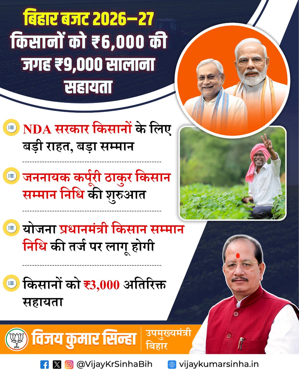 “राज्य सरकार किसानों की आय बढ़ाने और उन्हें आर्थिक रूप से सशक्त बनाने के लिए निरंतर कार्य कर रही है। जननायक कर्पूरी ठाकुर किसान सम्मान निधि योजना के तहत सहायता राशि बढ़ाकर ₹9,000 किए जाने से किसानों को खेती-किसानी के कार्यों में बड़ी राहत मिलेगी। हमारी सरकार का संकल्प है कि किसान मजबूत होगा तभी राज्य समृद्ध बनेगा।”