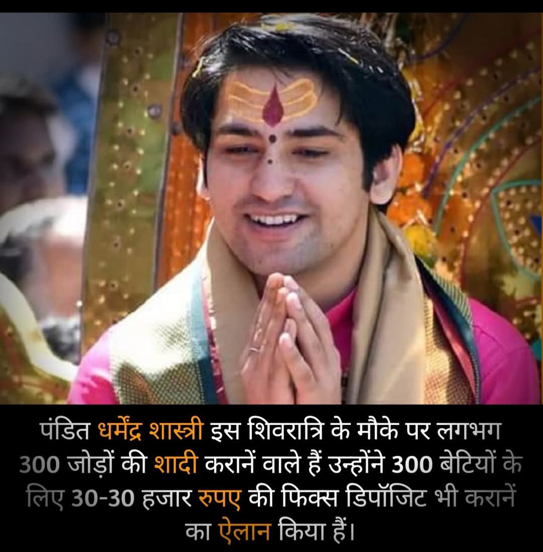 बागेश्वर धाम के पीठाधीश्वर पंडित धीरेंद्र कृष्ण शास्त्री महाशिवरात्रि (15 फरवरी 2026) के अवसर पर, 'सातवें कन्या विवाह महोत्सव' के अंतर्गत 300 से अधिक गरीब बेटियों की सामूहिक शादी करवा रहे हैं। इस सामाजिक सेवा पहल के तहत, बागेश्वर धाम प्रशासन द्वारा नवविवाहित जोड़ों के सुनहरे भविष्य के लिए 30-30 हजार रुपये की फिक्स्ड डिपॉजिट (FD) भी की जा रही है।