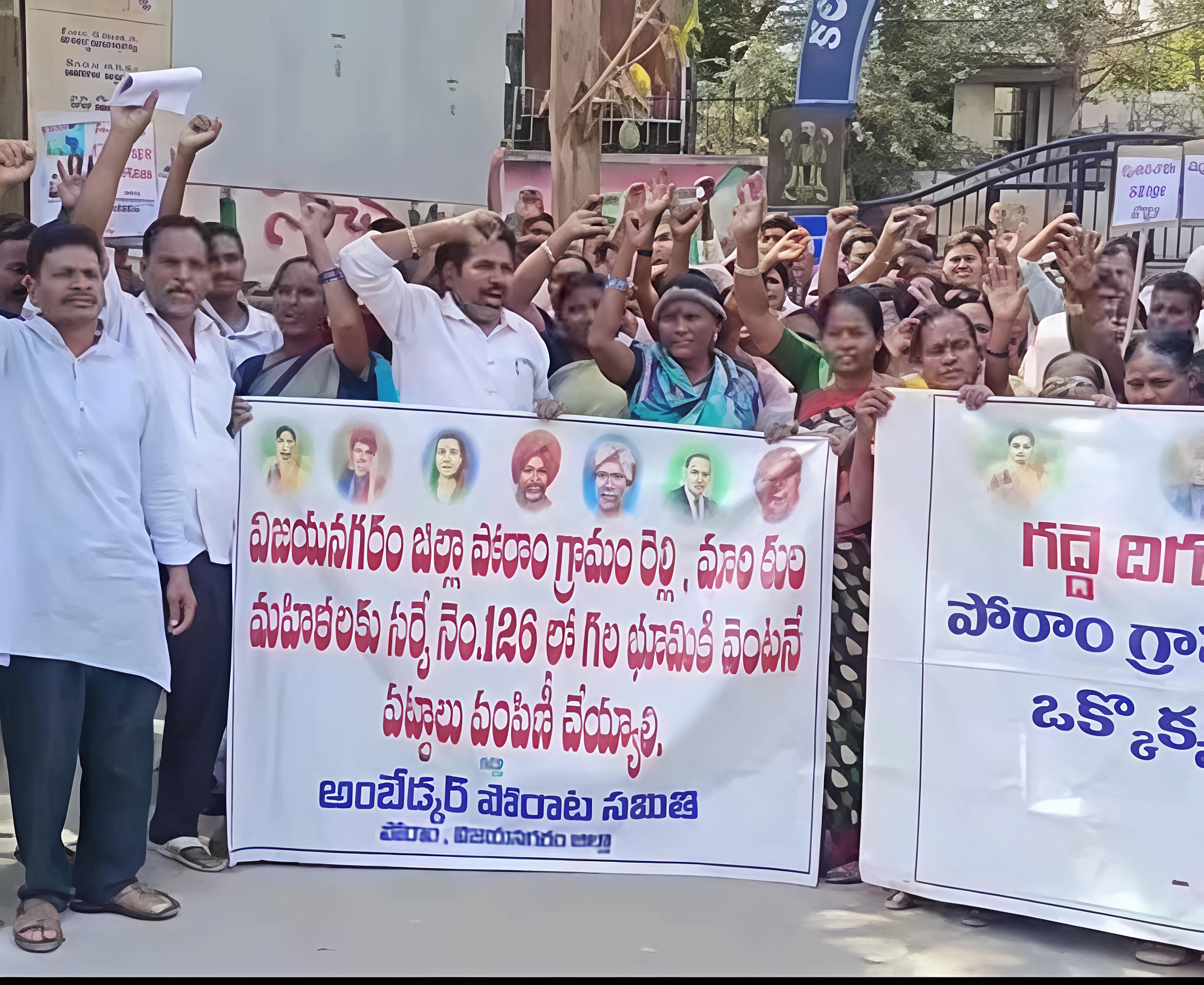 మెంటాడ మండలం పోరాంలో నివసిస్తున్న రెల్లి, దళిత కులస్థులకు భూమి పట్టాలు పంపిణీ చేయాలని అంబేడర్ పోరాట సమితి డిమాండ్ చేసింది. ఈ మేరకు కలెక్టరేట్ వద్ద స్థానికులతో కలిసి సోమవారం నిరసన తెలిపారు. పోరాంలోని సర్వే నెంబర్ 126లో ఉన్న భూమికి వెంటనే పట్టాలు పంపిణీ చేయాలని డిమాండ్ చేశారు. ఒక్కో కుటుంబానికి ఐదు ఎకరాల భూమి పంపిణీ చేయాలన్నారు. గద్దె దిగుతారా... భూములు పంచుతారా? అంటూ నినాదాలు చేశారు.