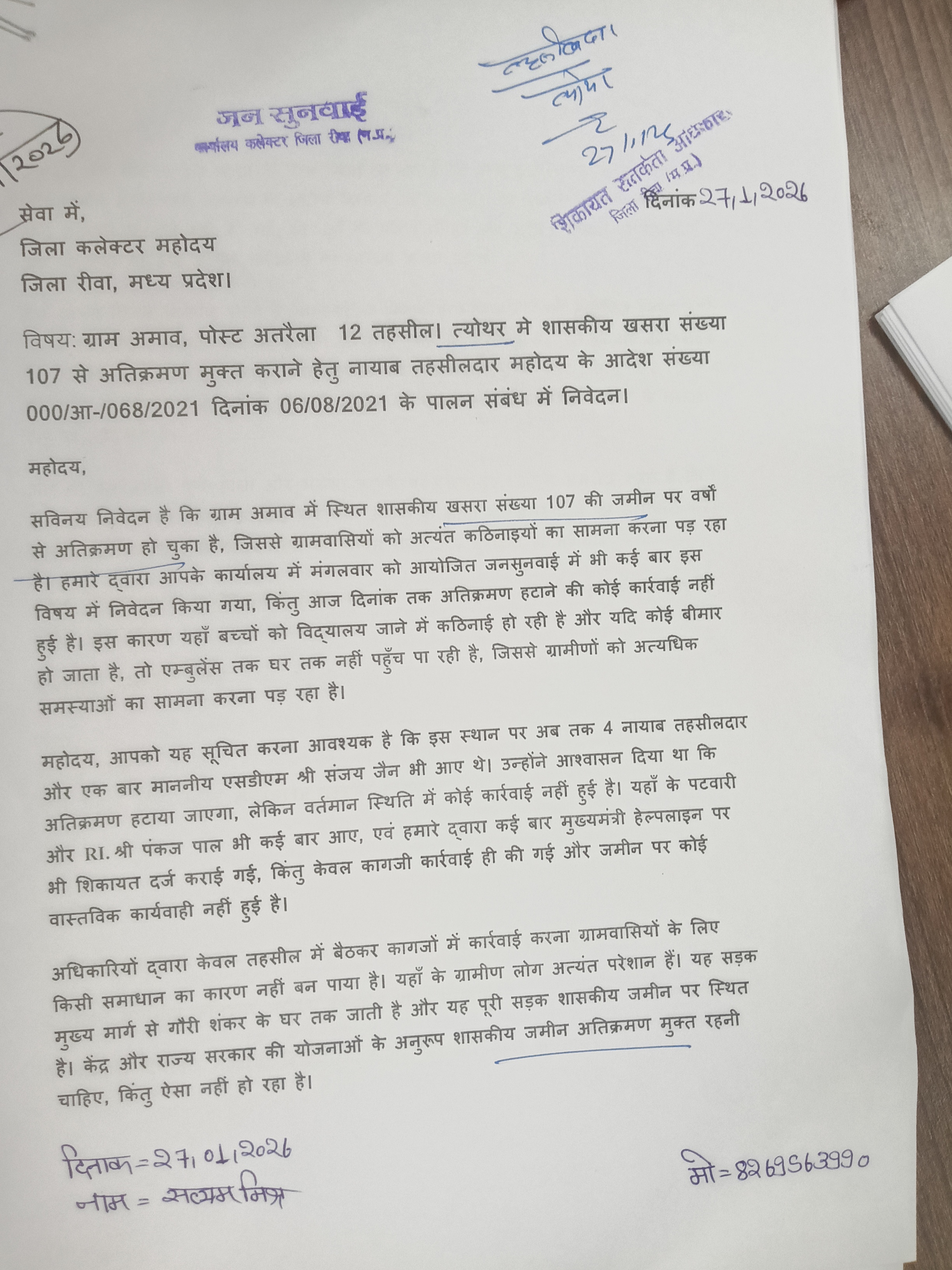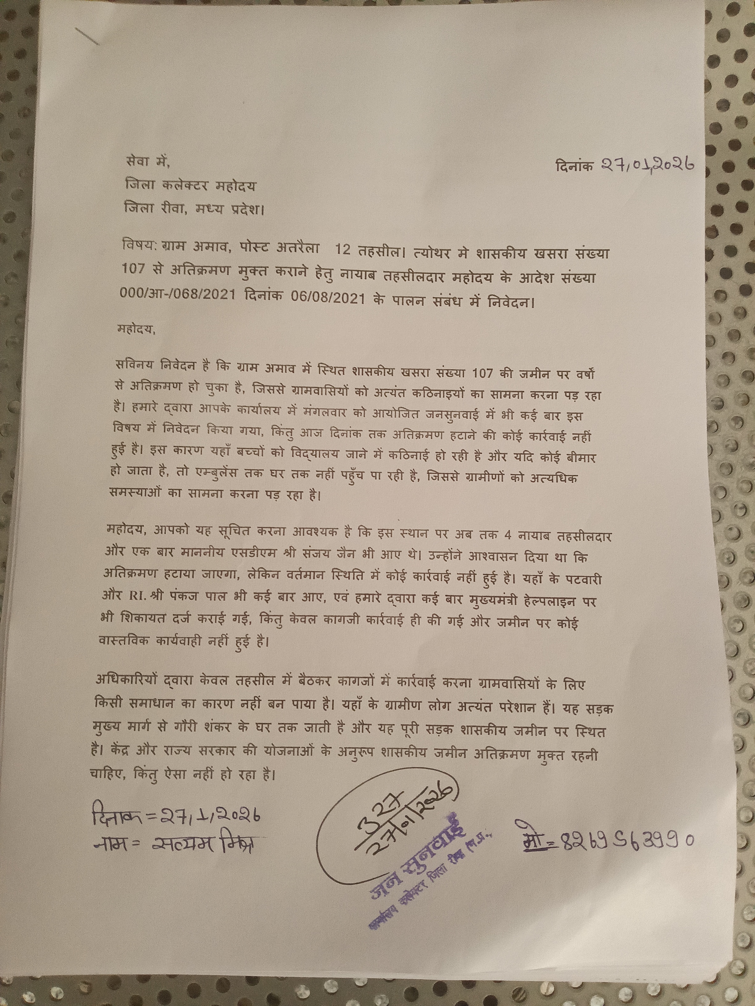 तहसील त्योंथर ग्राम पंचायत अमाव पोस्ट अतरैला 12 जिला रीवा मप्र शासकीय रोड खसरा नंबर 107 लोगों को हो रही है परेशानी पटवारी और आई ने बताया कि शासकीय रोड खसरा नंबर 107 का नक्शा फट गया है लोगों को आने जाने में हो रही है परेशानी इसमें शासन प्रशासन क्या अतिक्रमण खाली करने के लिए तैयार हैं