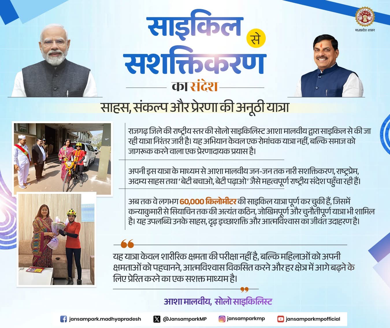 राजगढ़ जिले की राष्ट्रीय स्तर की सोलो साइकिलिस्ट आशा मालवीय अपनी इस यात्रा के माध्यम से जन-जन तक नारी सशक्तिकरण, राष्ट्रप्रेम, अदम्य साहस तथा ‘बेटी बचाओ, बेटी पढ़ाओ’ जैसे महत्वपूर्ण राष्ट्रीय संदेश पहुँचा रही हैं।