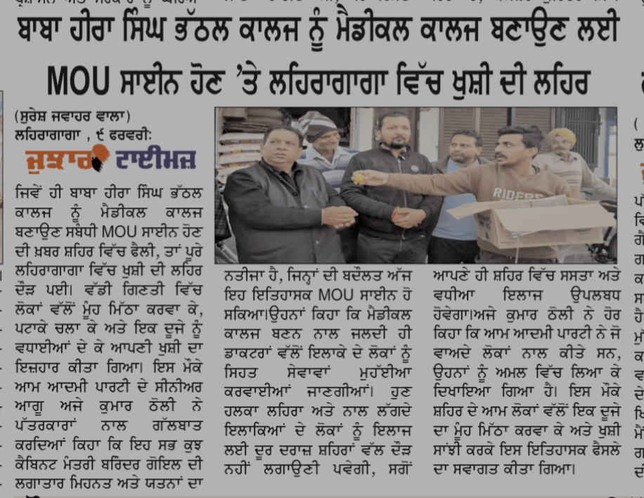 जैसे ही शहर में बाबा हीरा सिंह भट्टल कॉलेज को मेडिकल कॉलेज बनाने के लिए MOU साइन होने की खबर फैली, पूरे लहरागागा में खुशी की लहर दौड़ गई। बड़ी संख्या में लोगों ने मिठाइयां बनाकर, पटाखे फोड़कर और एक-दूसरे को बधाई देकर अपनी खुशी जाहिर की।
